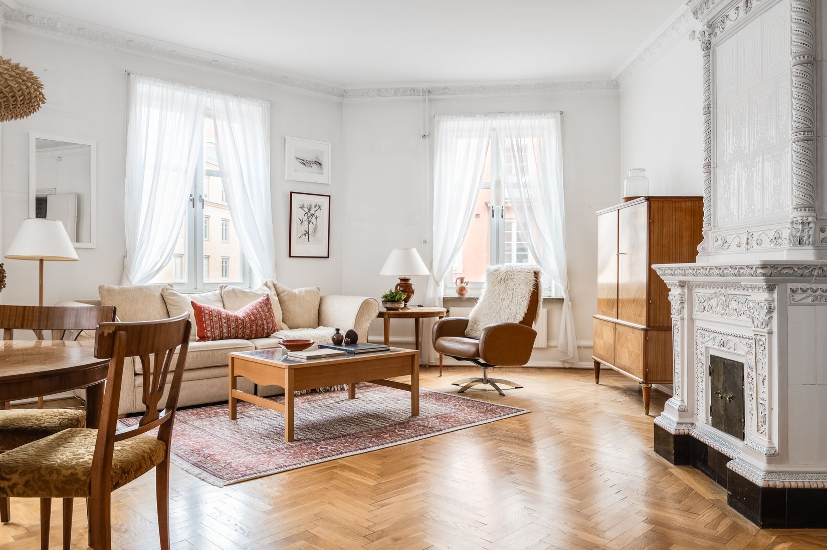 Vacker fiskbensparkett, charmiga kakelugnar och stora fönster skapar en varm och inbjudande atmosfär, medan balkongen mot den lugna innergården blir en rofylld oas för avkoppling mitt i citypulsen.