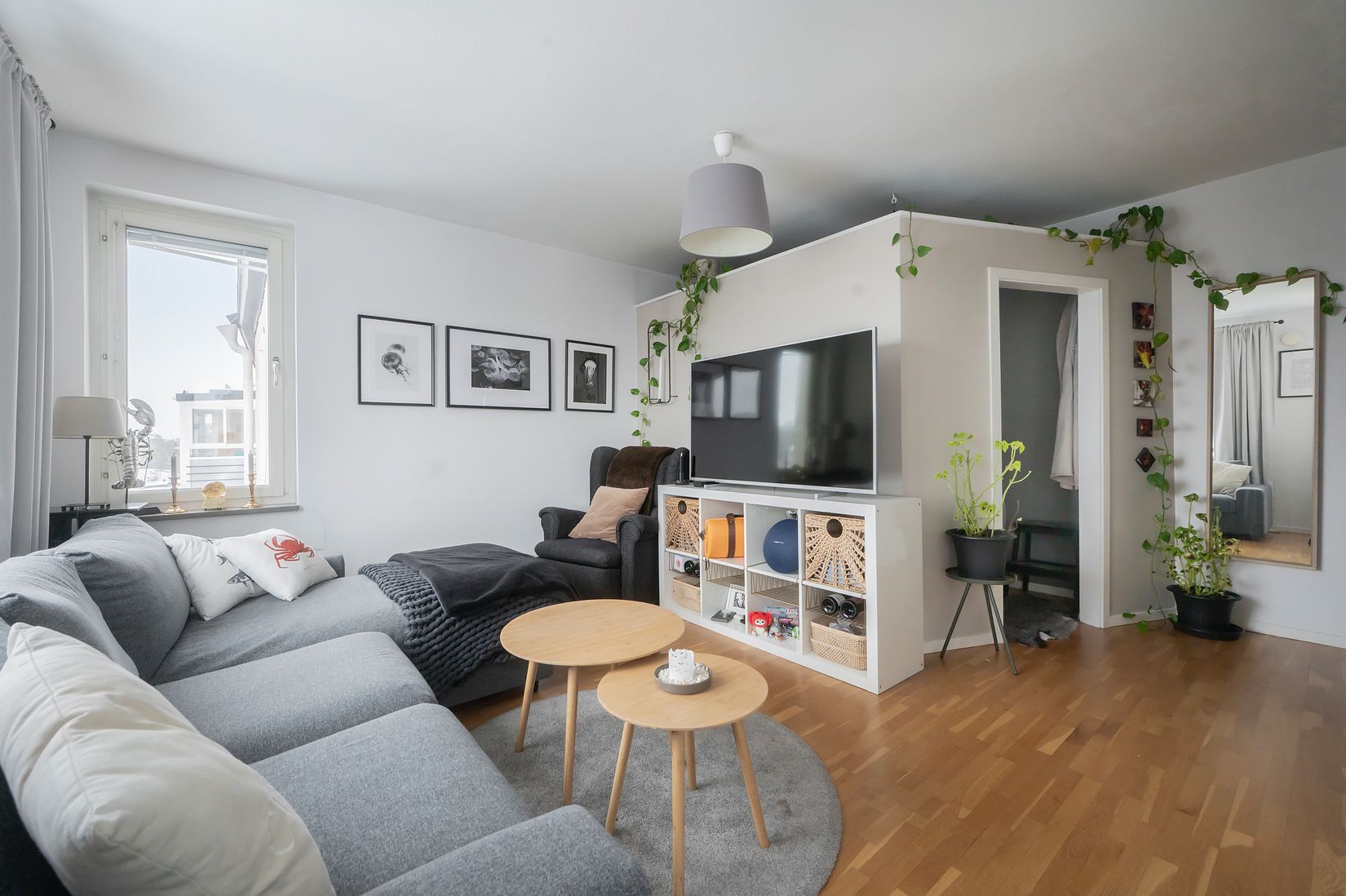 Vardagsrummet är lättmöblerat och rymmer både soffgrupp, matplats och arbetsyta. Den smarta sovalkoven skapar en avskild och mysig sovplats som ger bostaden en mer två-rumskänsla. Härifrån når du den inglasade balkongen som fungerar som ett extra rum stora delar av året - perfekt för morgonkaffet i solen eller avkopplande kvällar med vänner.