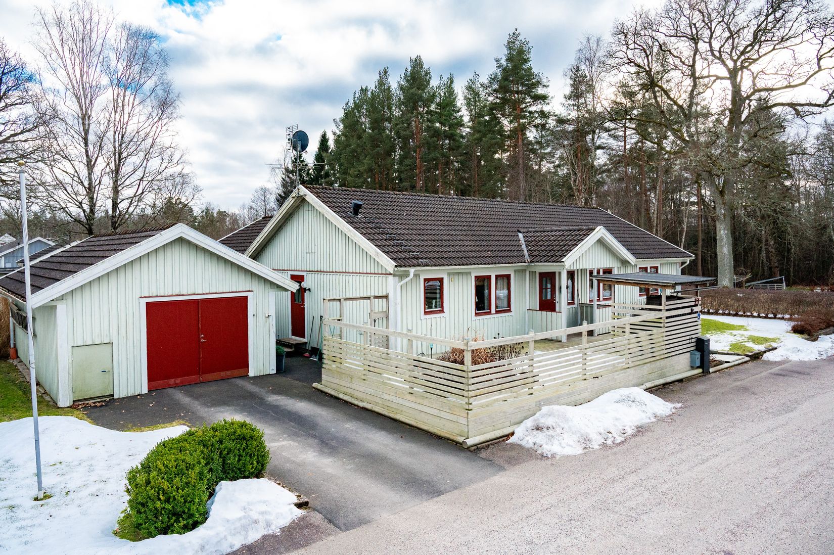 Här finns gott om förvaring med två förråd samt garage med bred asfalterad uppfart.