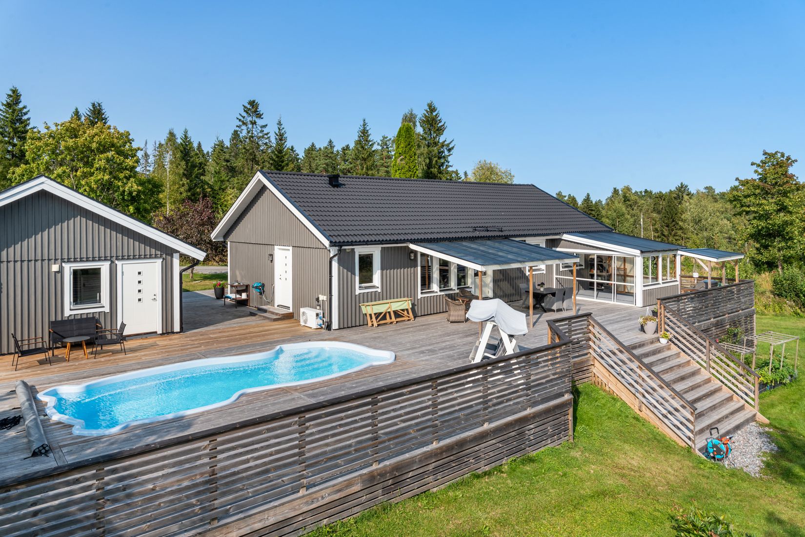 Poolen ger extra guldkant på tillvaron, och den separata bastun skapar en egen liten oas – perfekt efter en dag i skog och mark.