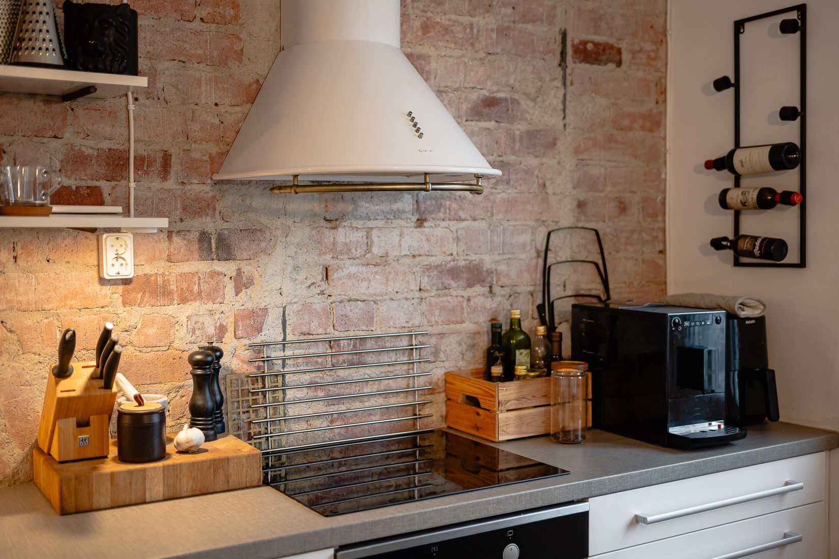 Det charmiga köket bjuder på en synlig, vacker tegelvägg som sträcker sig hela vägen upp till tak och ger rummet karaktär. Här finns gott om arbetsyta, öppna hyllor och plats för matbord intill fönstret som skänker ett fint ljusinsläpp. Köket är fullt utrustat och kombinerar funktion med en luftig och trivsam känsla.