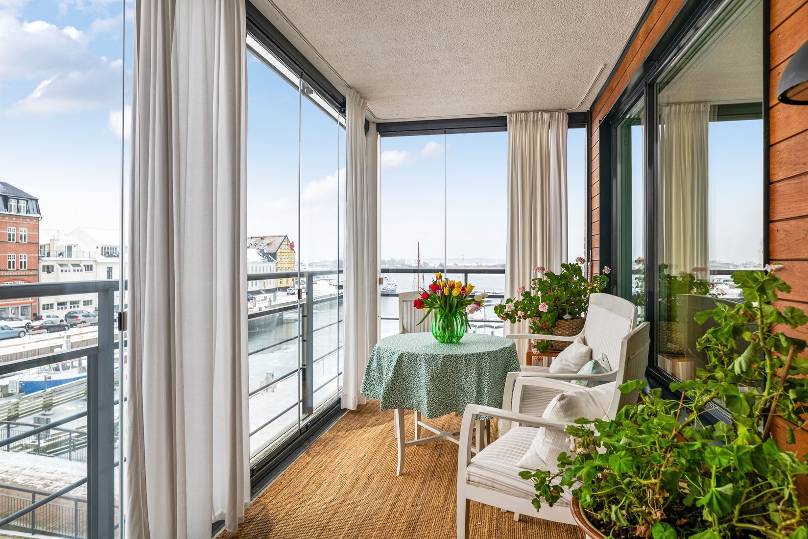 Den genomtänkta planlösningen bjuder på stora sociala ytor med delvis öppen planlösning mellan kök och vardagsrum som avskiljs av en praktisk köksö, två bra sovrum, stort helkaklat badrum med tvättmöjligheter och två härliga inglasade balkonger i olika väderstreck. Den största balkongen bjuder på förmiddagssol och ständigt föränderliga vyer över hamnen och Stadshuset, den andra balkongen ligger i solsäkert västerläge med fina utblickar mot havet, det nya Kallbadhuset samt bort mot Danmark. Inredningen i lägenheten går i smakfull färgskala med en bas av vitmålade väggar, parkettgolv i ek, fullutrustat kök med inredning i rogivande grått och ett helkaklat badrum i stilren färgskala med delvis ny inredning. Smarta skjutdörrsgarderober erbjuder gott om förvaringsmöjligheter och det största sovrummet har dessutom en praktisk klädkammare. Med lägenheten följer även ett förråd i källaren. Hiss finns från markplan för maximal tillgänglighet.