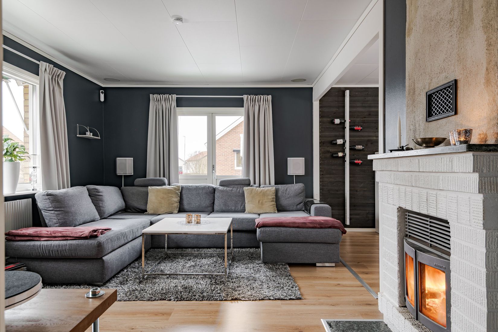 På entréplanet möts du av en öppen planlösning mellan kök, matplats och vardagsrum. Det är en social och lättmöblerad yta där vardagen får ta plats och där det är enkelt att samla familj och vänner. Den öppna spisen sprider värme och skapar en trevlig plats att samlas kring när det är kallt ute.