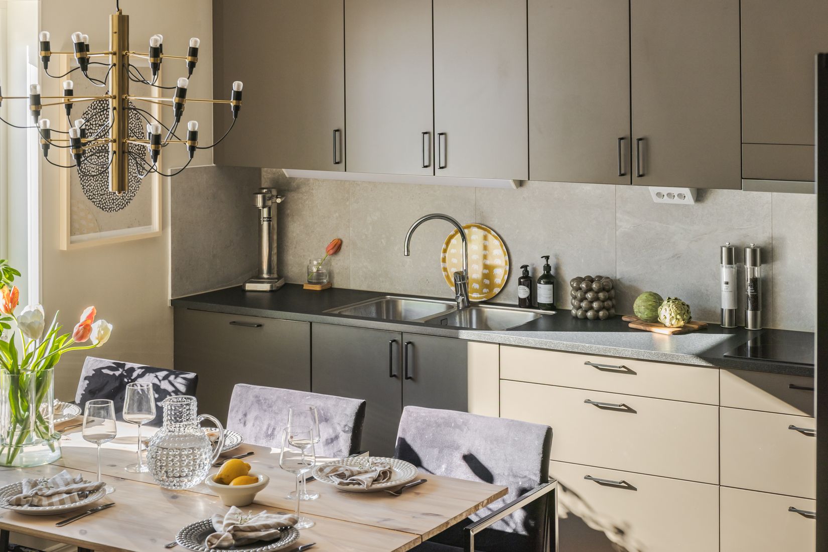 Bostaden erbjuder 112 välplanerade kvadratmeter fördelade över två våningsplan. Planlösningen är genomtänkt med generösa sociala ytor och fint ljusinsläpp som skapar en luftig och inbjudande atmosfär. Köket är välutrustat med rostfria vitvaror och erbjuder gott om arbetsyta för både vardagsmatlagning och festliga middagar.