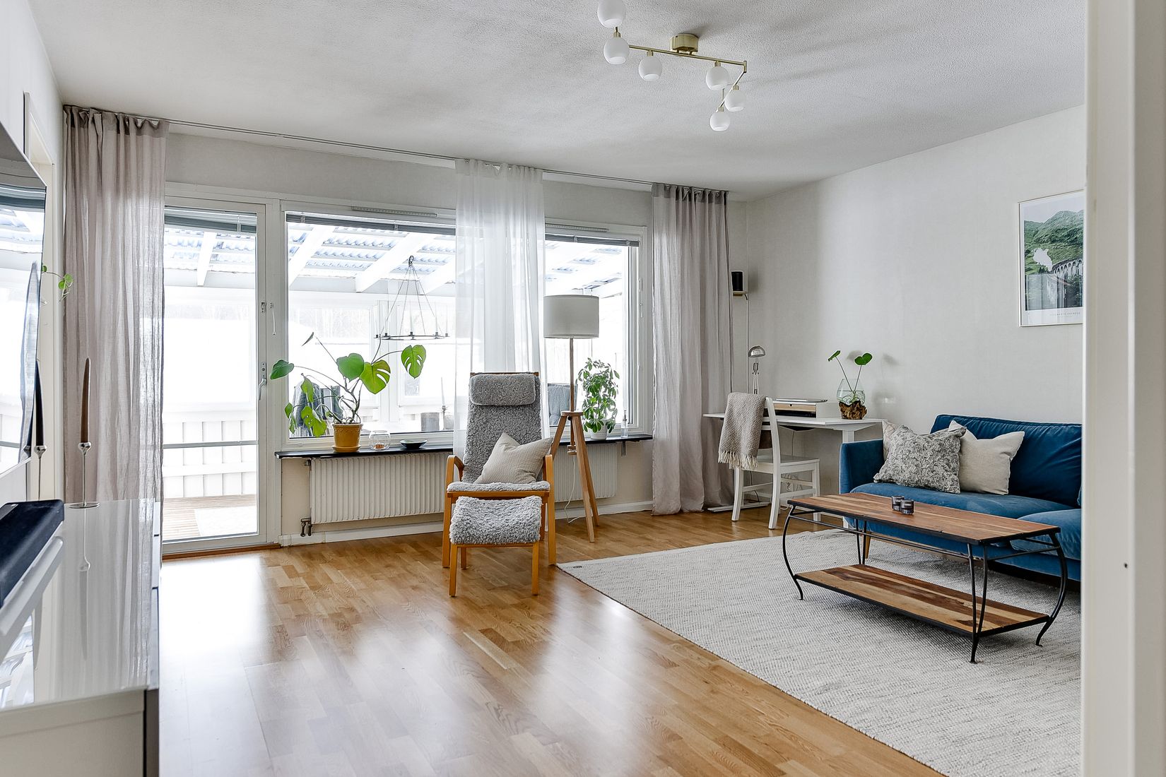 En av bostadens absoluta höjdpunkter är det inglasade uterummet som fungerar som ett extra vardagsrum under stora delar av året. Här njuter ni av sena sommarkvällar, sociala tillställningar och lugna stunder med en kopp kaffe. Från uterummet kliver ni vidare ut på gräsytor, och tack vare gavelläget kan ni röra er fritt runt huskroppen där föreningens grönytor upplevs som en naturlig förlängning av bostaden.