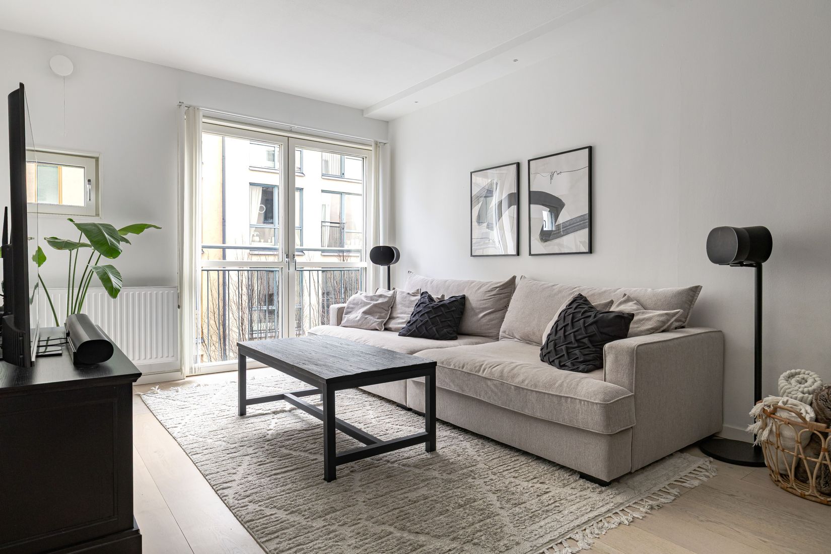 Vardagsrummet ligger i öppen planlösning mot köket och erbjuder lättmöblerade ytor för soffa, tv och personligt möblemang. Den franska balkongen släpper in rikligt med ljus och förstärker känslan av rymd och stadsliv.