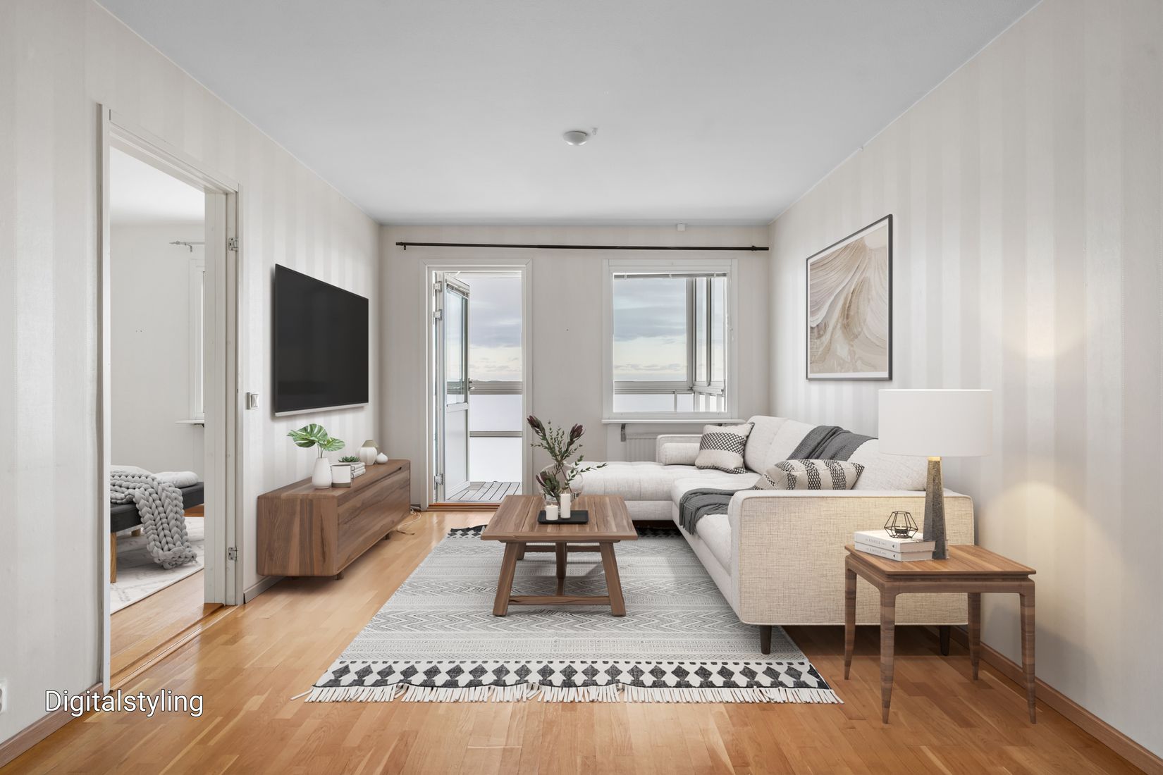 Köket är äldre men välhållet, här ryms ett matbord för 4–6 personer. Två sovrum som ligger åtskilt placerad i bostaden. Via det stora sovrummet når man den ena av två balkonger i lägenheten. Från vardagsrummet når man den andra balkongen. Båda är inglasad och har fantastisk utsikt. Det finns ett badrum i lägenheten som har våtrumsmatta på golvet och kaklade väggar.