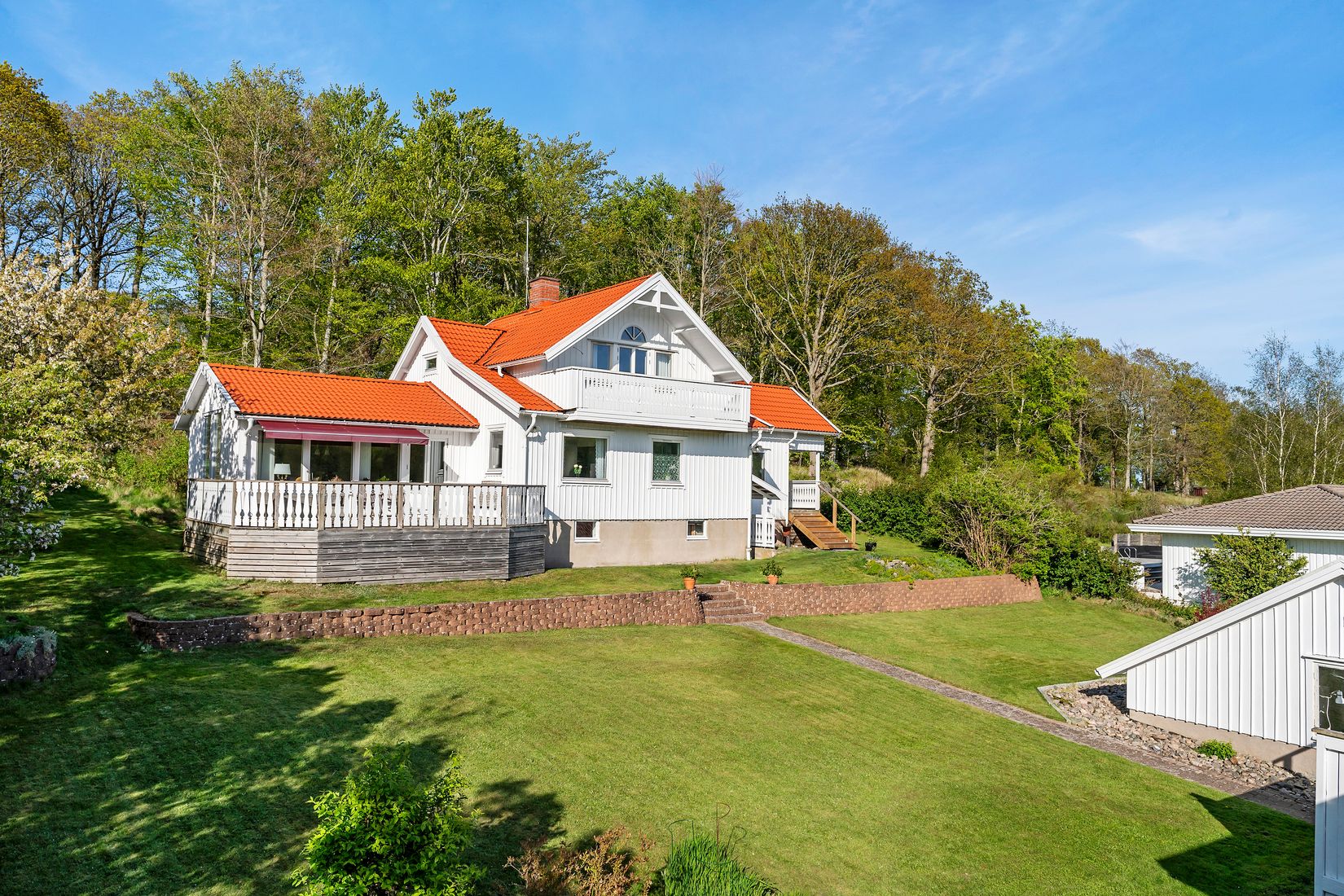Den vackra exteriören i klassisk vit träpanel och röda takpannor smälter harmoniskt in i den naturnära omgivningen. Framsidan öppnar upp mot en välskött, rymlig trädgård som bjuder in till lek, avkoppling och sommarens alla aktiviteter. Den generösa altanen, placerad i bästa solläge, blir en självklar samlingspunkt för både vardag och fest – perfekt för grillkvällar, familjemiddagar eller lata sommardagar. Från altanen har man utsikt över den stora, grönskande tomten som breder ut sig i flera nivåer och erbjuder gott om plats för både lek och rekreation.