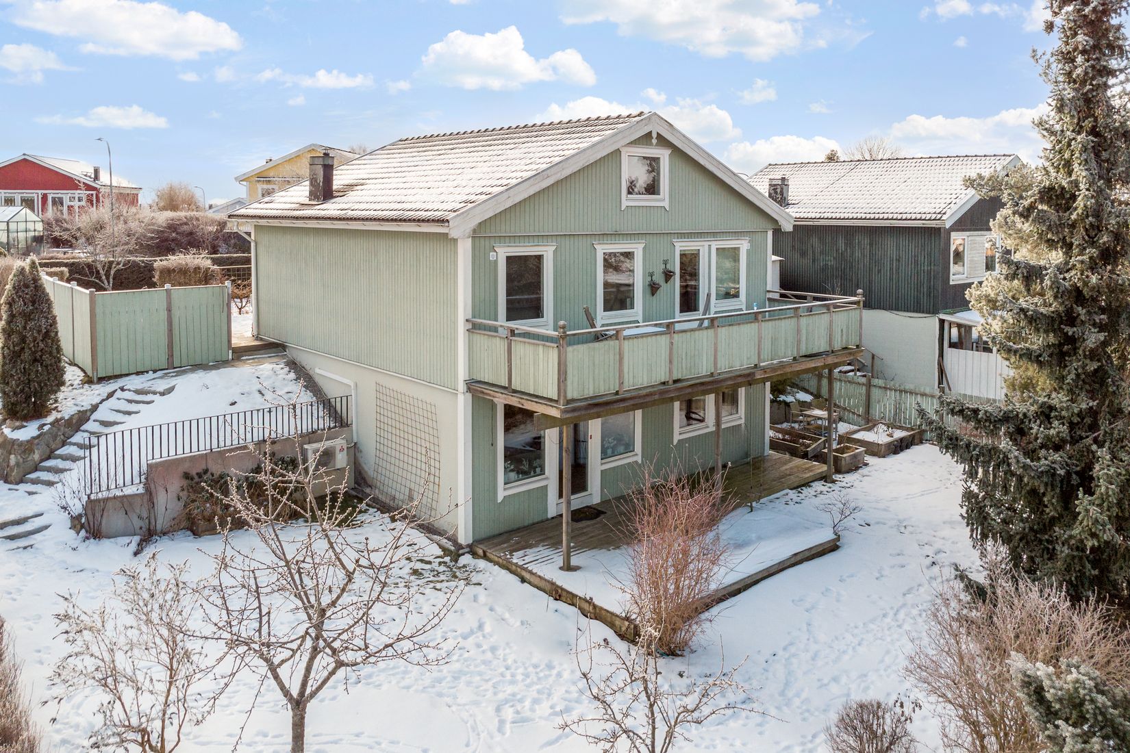 Den friköpta tomten har ett högt, fritt läge som ger sol från morgon till kväll. Trädgården är inhägnad med staket och frodiga häckar och erbjuder flera härliga uteplatser. På framsidan finns en solig uteplats i söderläge med spabad, perfekt för avkoppling året runt. På baksidan väntar en balkong längs hela husets längd samt en stor altan med plats för både loungemöbler och grill. Här finns även plana, lekvänliga ytor för barnen, uppvuxna träd och buskar samt fina odlingsmöjligheter för den trädgårdsintresserade. Till huset hör ett garage samt uppställningsplats för två bilar framför.