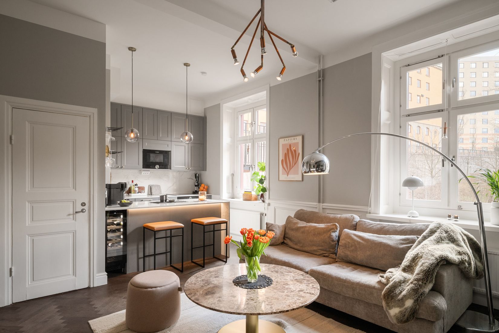Välkommen till en stilren och välplanerad bostad med social öppen planlösning och fint ljusinsläpp från två fönster i fil. Vardagsrummet är luftigt och erbjuder plats för soffgrupp och tv-möbel. Mörk fiskbensparkett, ljusa väggar och vacker bröstpanel skapar en elegant och tidlös känsla. Förvaring finns i en stor garderob med spegelskjutdörrar. Köket ligger i öppen anslutning och präglas av smakfulla materialval med grå luckor, ljus bänkskiva och mässingsdetaljer. Gott om arbetsyta och förvaring utrustat med ugn, inbyggd mikro, diskmaskin, fläkt samt kyl och frys. Köksön med vinkyl och barplatser blir en naturlig samlingspunkt. Sovrummet är avskilt beläget en halv trappa ner med ljusa väggarna och ljus heltäckningsmatta. Här ryms större säng och förvaring, och härifrån nås den rymliga balkongen. Badrummet är helkaklat med vitt kakel och mörkt klinker, golvvärme, utrustat med wc, handfat, spegelskåp, handdukstork och dusch med glasvägg. Hallen är välkomnande med klinkergolv och ljusa väggar med bra avhängningsmöjligheter.