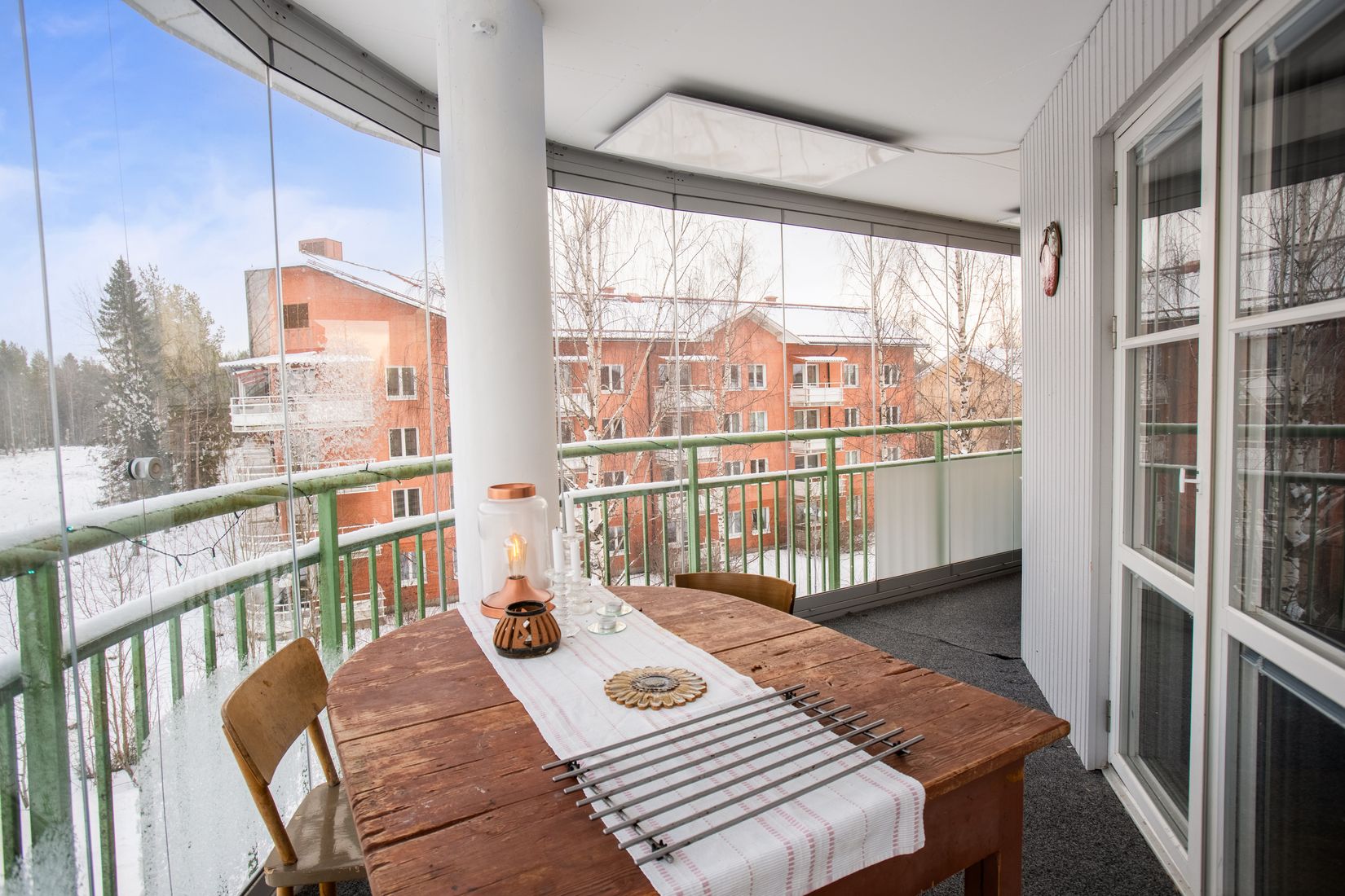 Nu erbjuds en mycket attraktiv och ljus 2,5-rummare med högt och fint läge i huset. Bostaden har en generös balkong som löper i vinkel runt vardagsrummet – delvis inglasad och delvis öppen, vilket ger möjlighet att njuta av både skyddat uterum som frisk luft. Under sommarkvällar når solen balkongen omkring kl. 18 och skapar en härlig kvällsatmosfär.