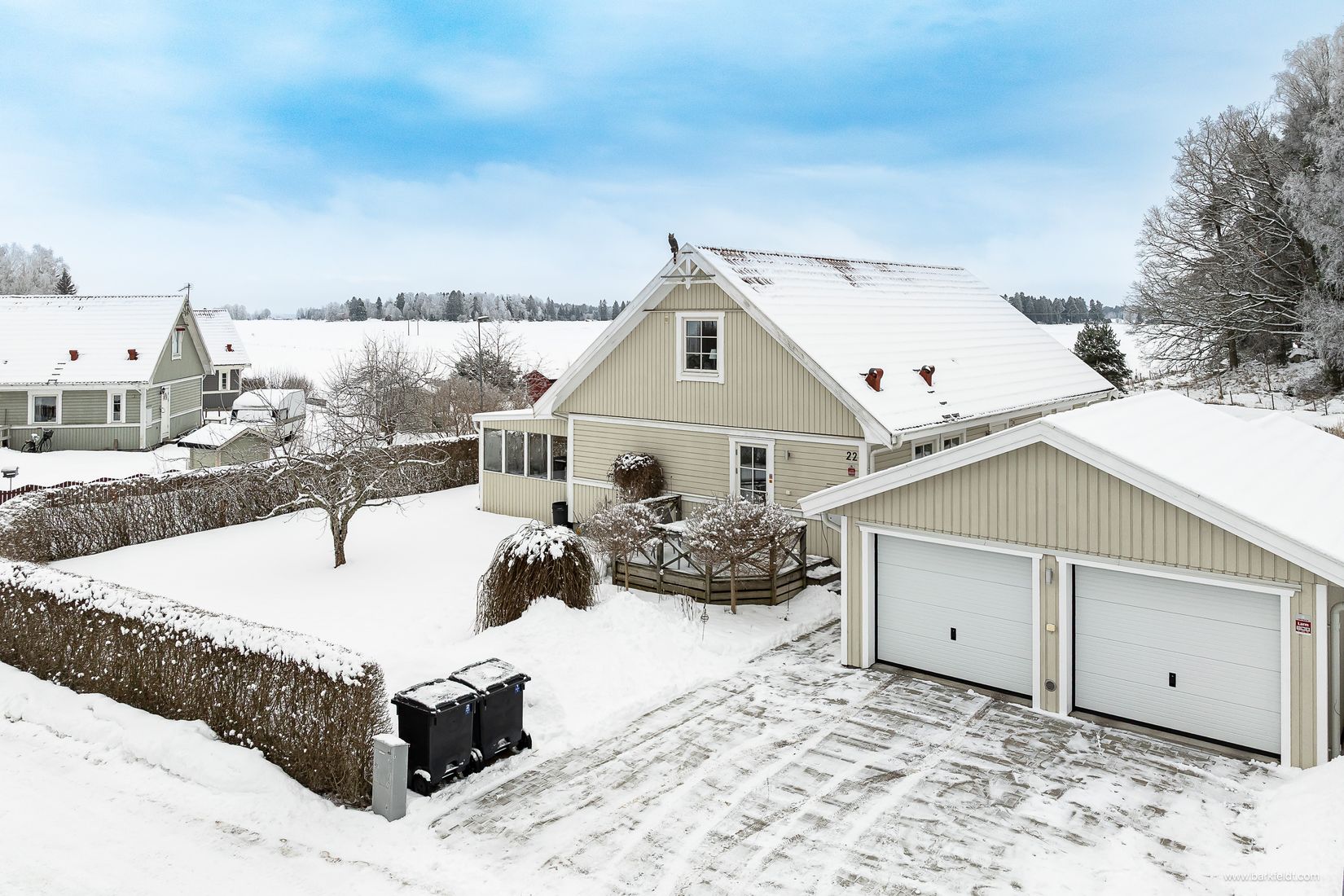 Den välskötta tomten ramas in av insynsskyddande häckar och erbjuder fina gräsytor för lek och avkoppling. På den stensatta uppfarten finns plats för flera bilar samt ett rymligt dubbelgarage med utrymme för två fordon. Intill garaget finns även ett isolerat förråd. Elbilsladdare är installerad i garaget och fiber är indraget i huset. På den fint belägna tomten som gränsar till allmänning och skogsparti finns dessutom en friggebod.