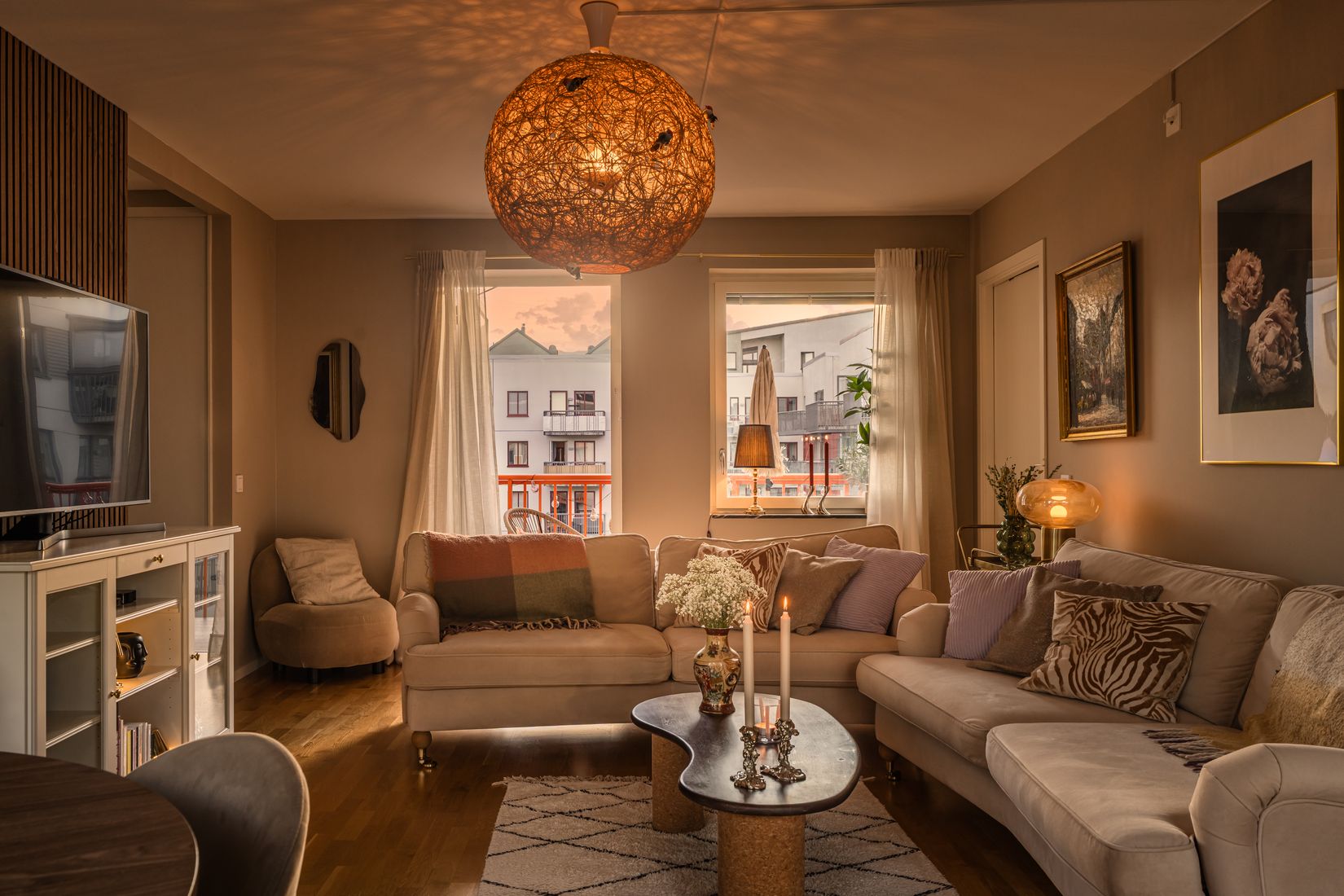 Bostadens hjärta är det delvis öppna köket och vardagsrummet, en social yta där familj och vänner kan umgås samtidigt som ljuset dansar in från fönster och balkongdörrar. Från vardagsrummet når du den generösa balkongen mot innergården, perfekt för morgonkaffet, middagar i kvällssolen eller en stund i lugn ro med utsikt över gårdens grönska. Här finns även en fransk balkong som skapar ytterligare ljusinsläpp och känsla av frihet.