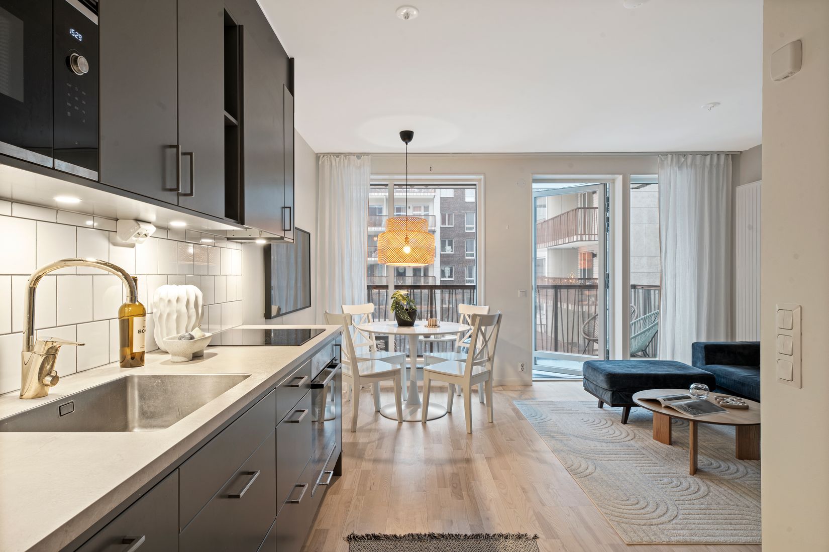 Köket är stilrent och funktionellt med släta skåpluckor i en varm mörkgrå nyans. Ovanför arbetsbänken i ljusgrå ton sitter ett klassiskt vitt kakel satt i halvförband. Den maskinella utrustningen består av integrerad mikrovågsugn i överskåp, ugn, induktionshäll, diskmaskin samt en kombinerad kyl och frys. Köket övergår naturligt i vardagsrummet, där det finns plats för både en matplats och en soffgrupp. Från vardagsrummet når man lägenhetens balkong via en helglasad dörr, vilket ger ett generöst ljusinsläpp till hela rummet.