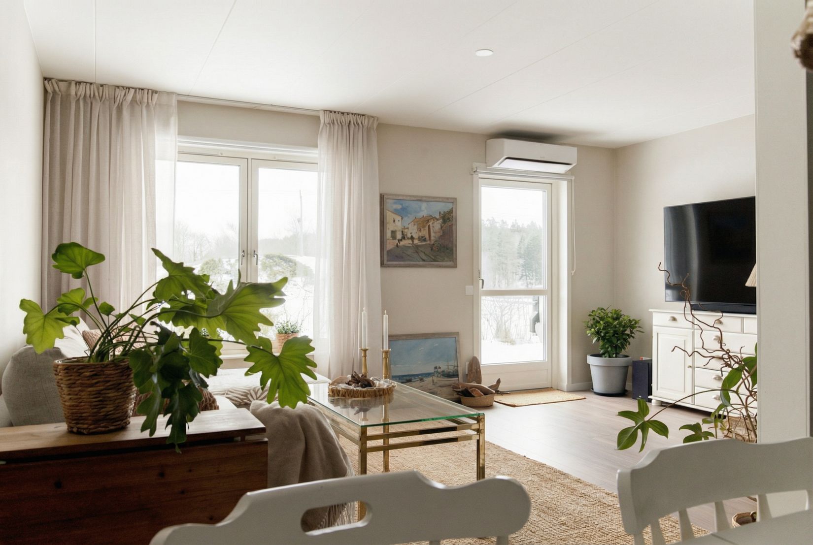 Köket ligger i öppen planlösning mot vardagsrummet och är funktionellt utformat med bra arbetsyta och social kontakt med övriga bostaden. De stora fönsterpartierna ger ett fint ljusinsläpp och vardagsrummet rymmer både soffgrupp och matplats med goda möbleringsmöjligheter.