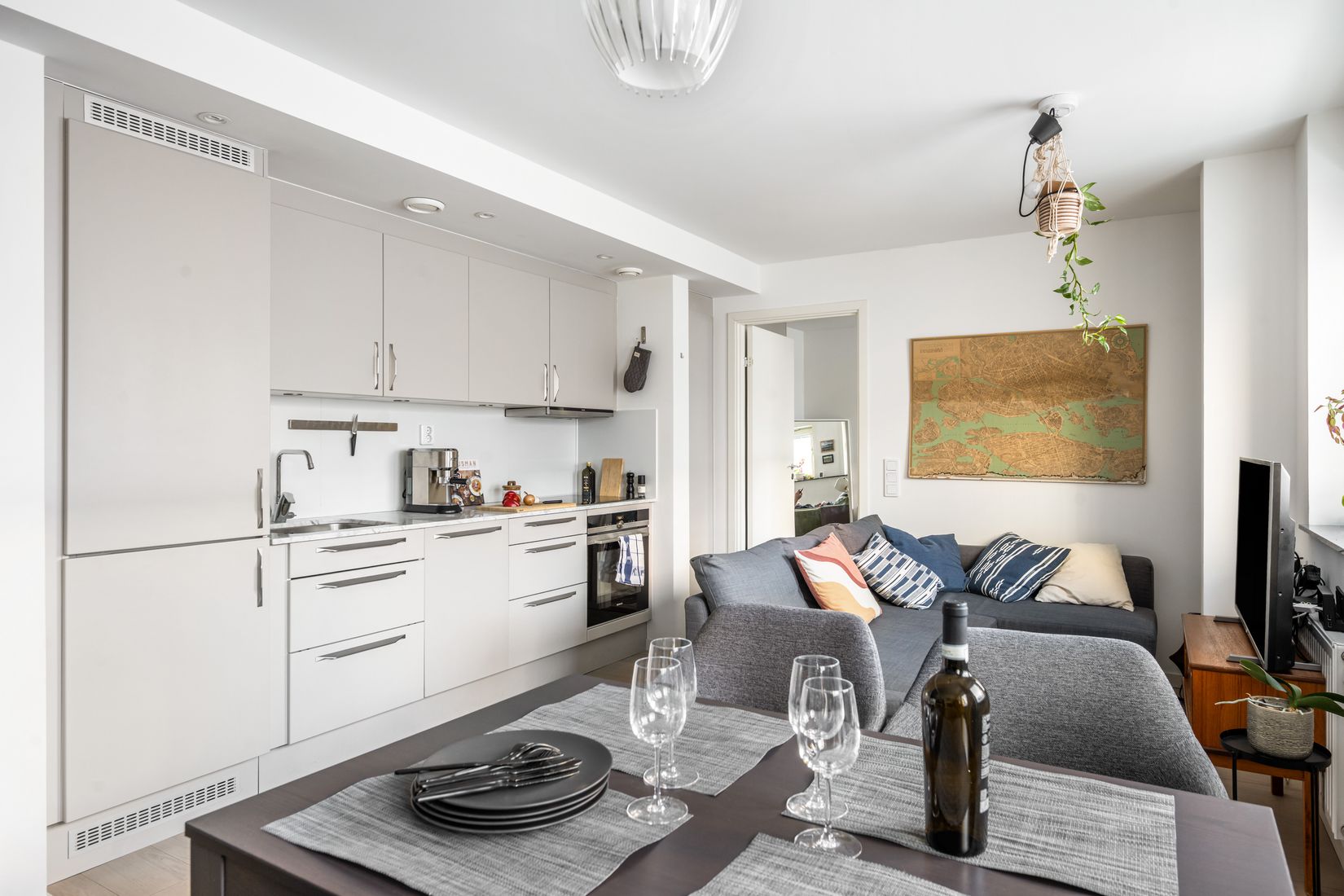 Bostaden erbjuder en ljus och trivsam planlösning med ett rymligt vardagsrum med öppen planlösning, ett stort sovrum samt gott om förvaringsmöjligheter. Köket är fräscht och har matplats för 2–4 personer samt utrustning som diskmaskin, kyl och frys, ugn, spis och fläkt. Badrummet är rymligt och utrustat med tvättmöjligheter – en stor bekvämlighet i vardagen. Till lägenheten hör även ett källarförråd.