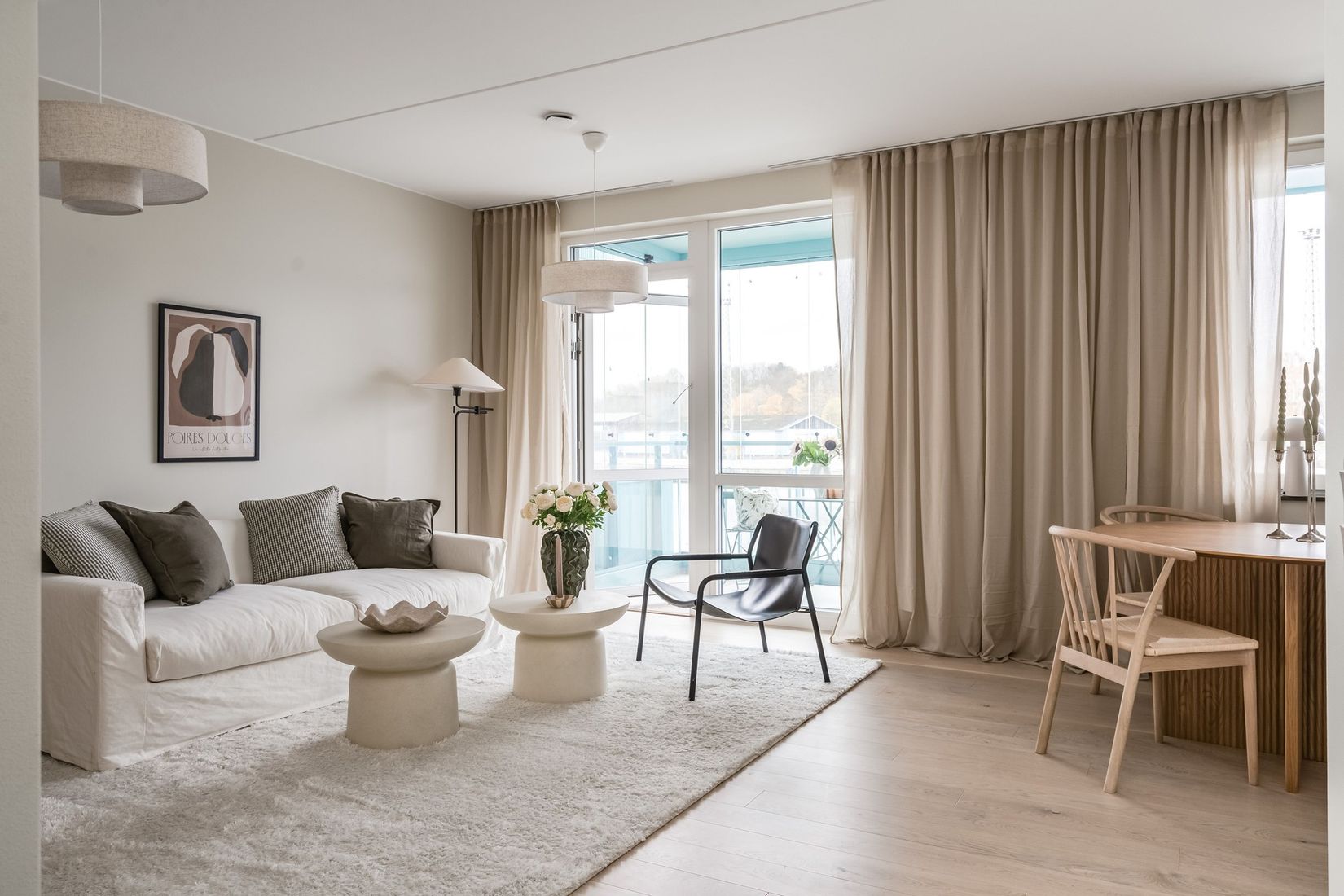 Denna stilrena lägenhet om tre rum och kök erbjuder ett fantastiskt ljusinsläpp. Här bor du i en socialt planerad bostad med öppen planlösning mellan kök och vardagsrum med utgång till inglasad balkong. Två rymliga sovrum, två helkaklade duschrum varav det ena är utrustat med både tvättmaskin och torktumlare. Till lägenheten hör ett förråd i källaren.
