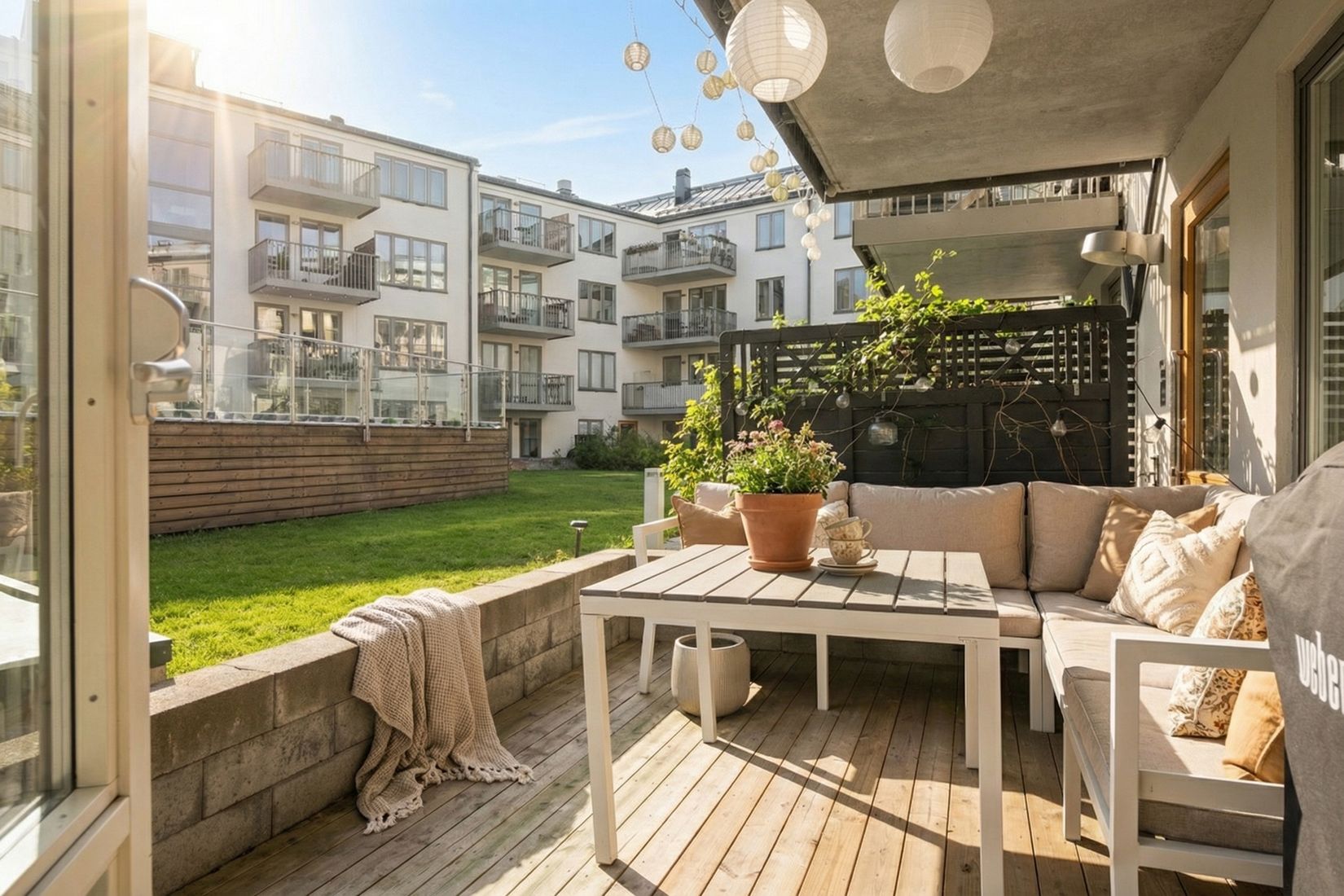 Lägenheten badar i eftermiddags- och kvällssol, vilket gör uteplatsen till en självklar samlingspunkt. Här blir det gärna spontant häng för både stora och små.