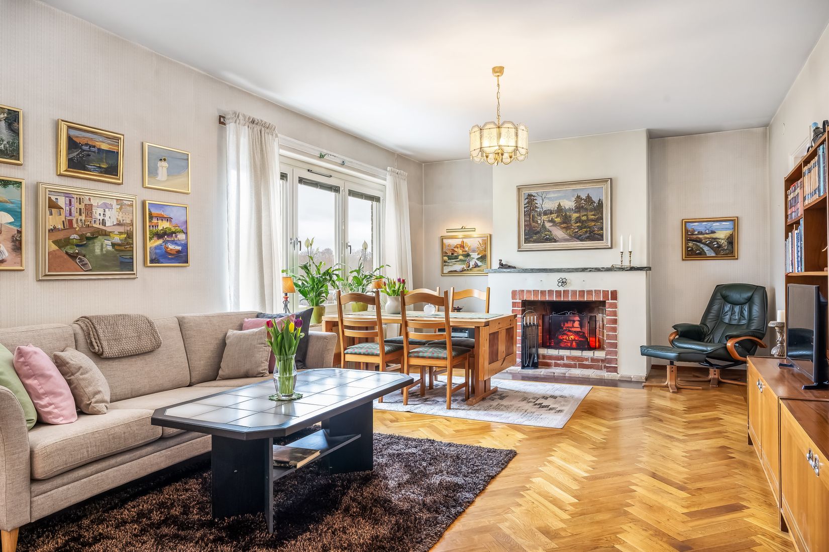 Bostaden erbjuder ett generöst vardagsrum med vacker fiskbensparkett och utgång till balkong, en perfekt plats för morgonkaffet eller en stund i solen. Köket är fint och funktionellt med plats för matbord. Vidare finns två trivsamma sovrum, ett badrum samt en praktisk gäst-wc. Planlösningen är väl genomtänkt och bostaden är genomgående välskött med en hemtrevlig känsla.