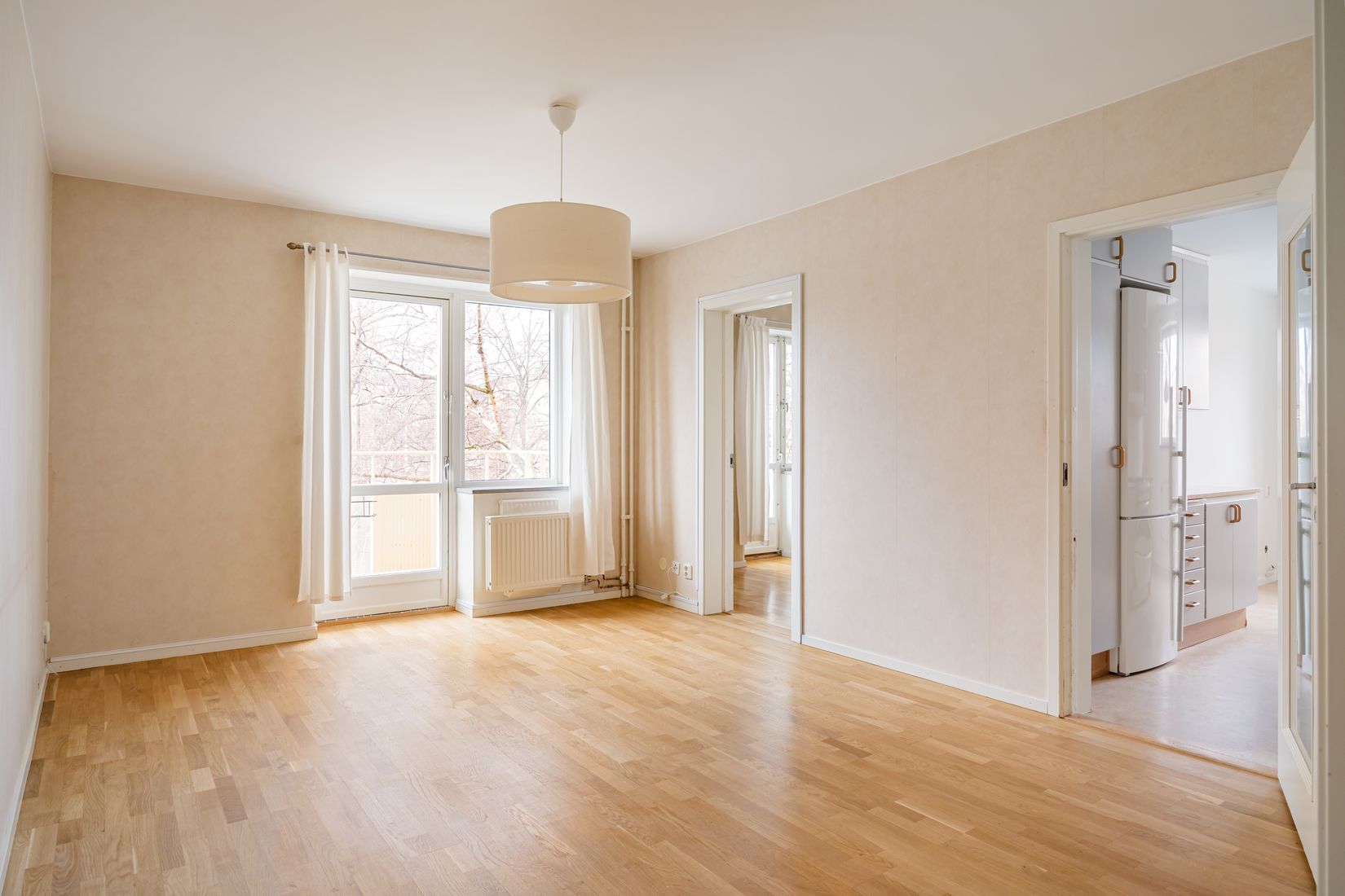 Vardagsrummet är centralt placerat och har utgång till bostadens balkong i väst/nordvästläge, där du kan njuta av eftermiddags- och kvällssol. Från ett av de två sovrummen nås en fransk balkong som ger extra ljus och rymd. Båda sovrummen är utrustade med dubbla garderober och i hallen finns dessutom en större klädkammare som erbjuder utmärkta förvaringsmöjligheter.