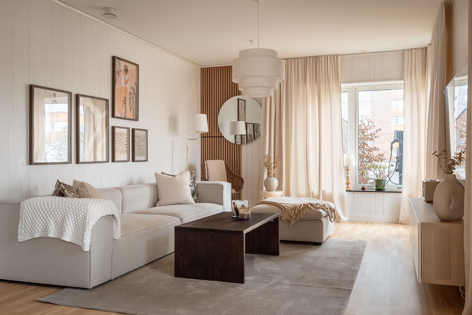 Vardagsrummet och köket ligger i öppen planlösning, vilket ger en rymlig och social yta. Här finns gott om plats för både soffgrupp och matbord. Köket är modernt och funktionellt med bra arbetsytor och generös förvaring – praktiskt för både vardag och middagar med vänner. Sovrummet är väl tilltaget och rymmer enkelt en dubbelsäng samt garderober eller annan förvaring. Badrummet är fräscht och stilrent med modern standard samt tvättmöjligheter för att underlätta vardagen.