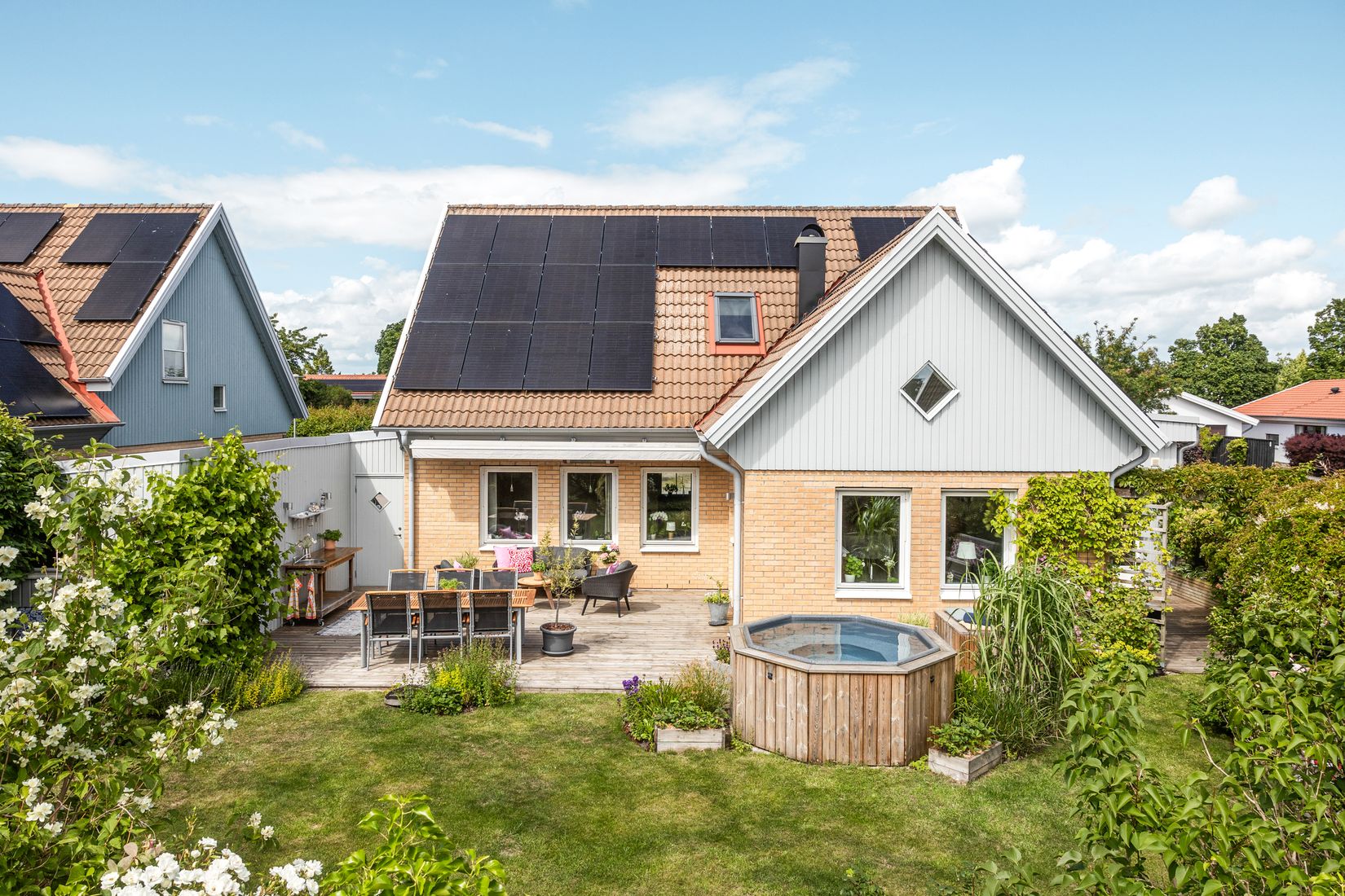 Tillbyggd 1 1/2-plansvilla i mycket gott skick – 167 kvm med solpaneler, elbilsladdare & spabad