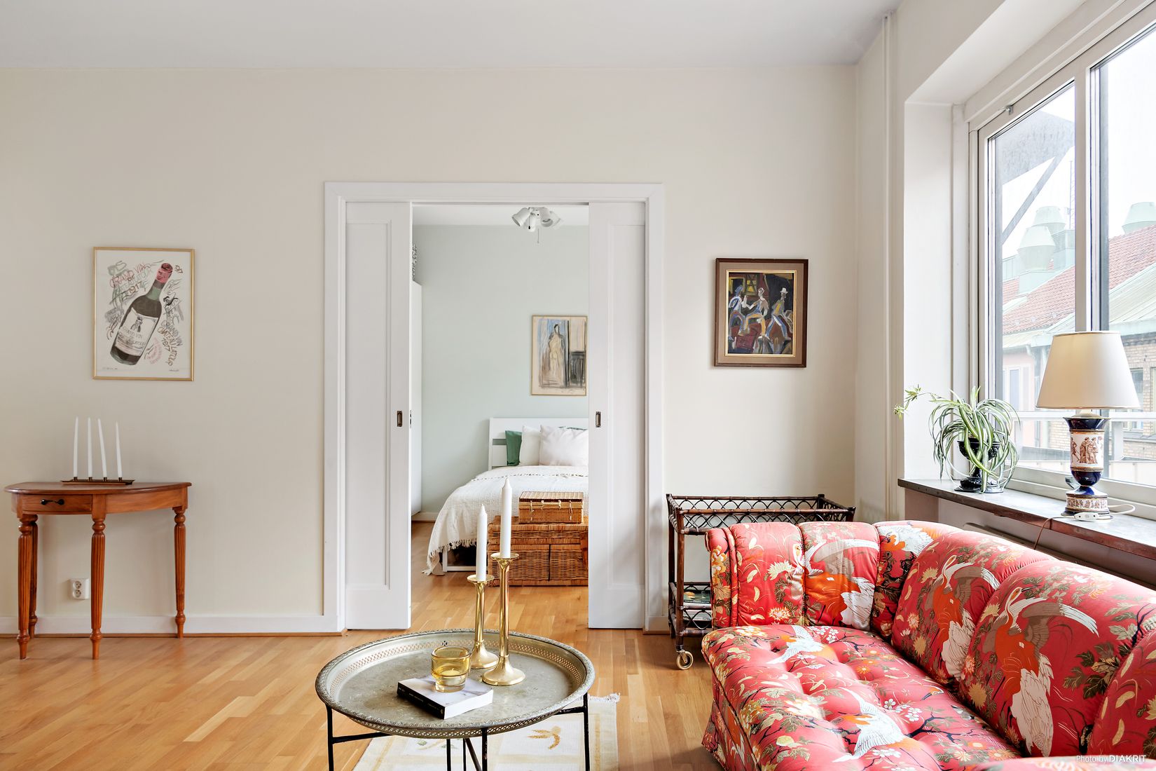 När du kliver in möts du av ett genomgående parkettgolv som skapar en varm och enhetlig känsla i hela bostaden.