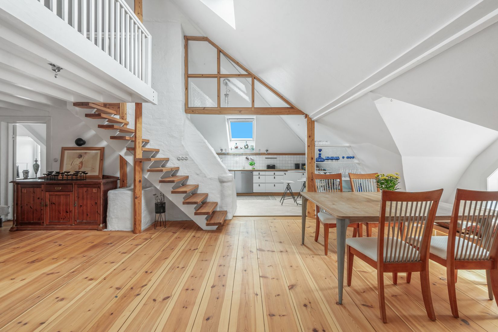 Invändigt fortsätter intrycken att imponera. En välkomnande hall med generös avhängningsyta öppnar upp mot det storslagna vardagsrummet – bostadens självklara hjärta. Här samsas breda golvtiljor, synliga takbjälkar och en imponerande takhöjd om hela 4,3 meter vid högsta punkt. Ljusinsläppet från både klassiska fönster och takfönster förstärker rymden och samspelar vackert med bostadens arkitektoniska vinklar.