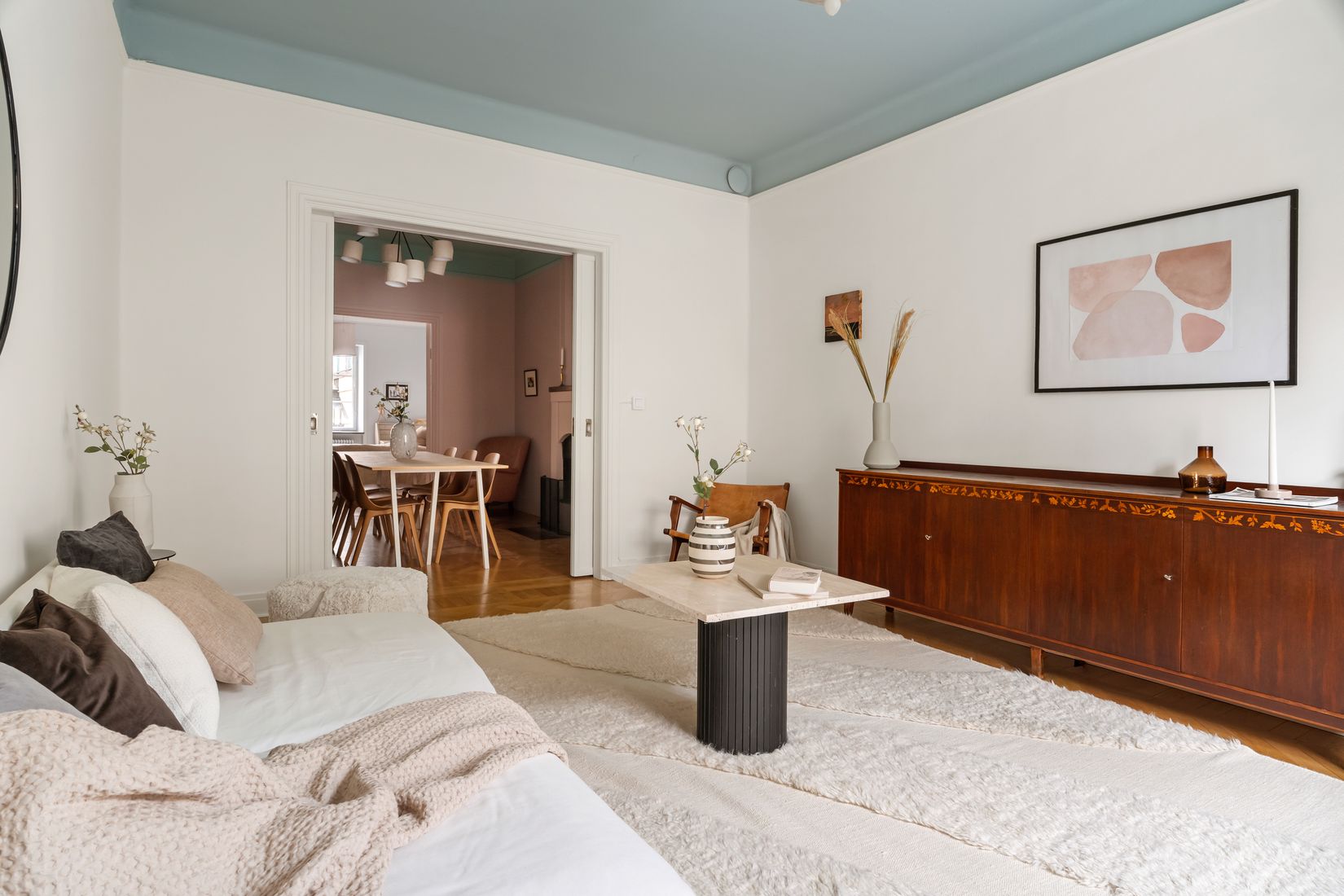 Den generösa planlösningen bjuder på stora sociala ytor och flera sovrum som enkelt kan anpassas efter olika behov och livssituationer. De tre rummen i fil skapar ett vackert flöde och ett naturligt ljus genom bostaden, samtidigt som de breda dörröppningarna förstärker känslan av rymd och sammanhang mellan rummen.