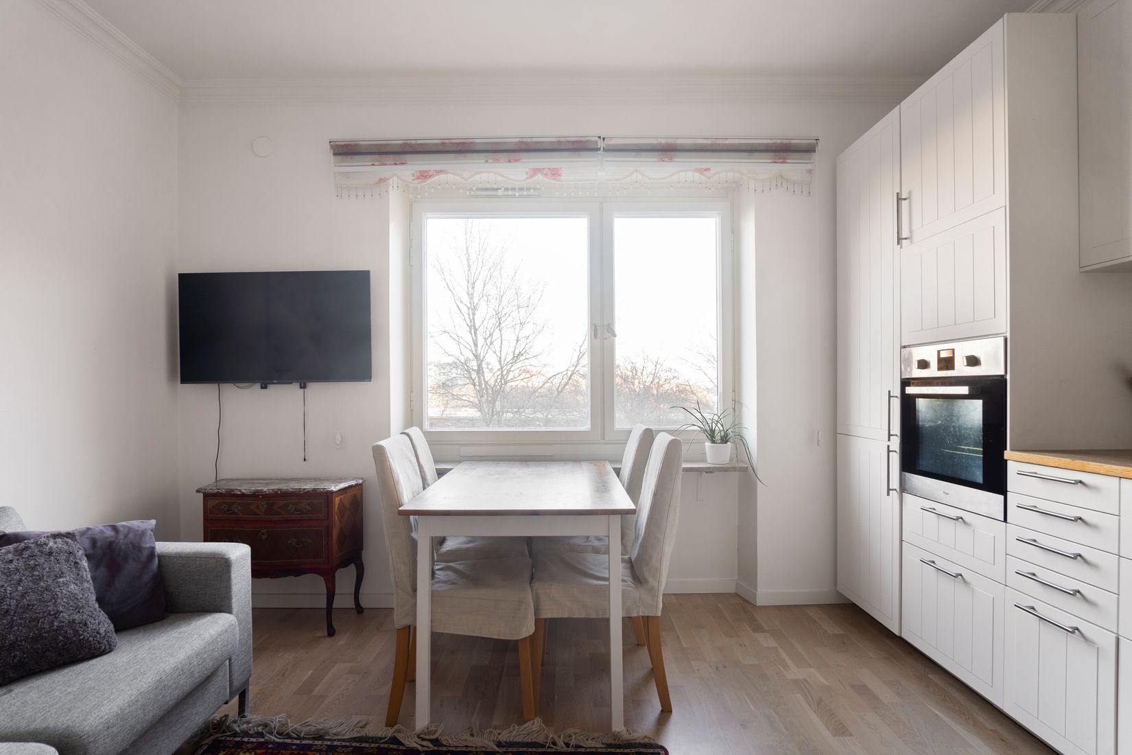 Från balkongen blickar du ut över grönskan och de lummiga träden mot Rålambshovsparken, en rofylld vy som ger bostaden det lilla extra.