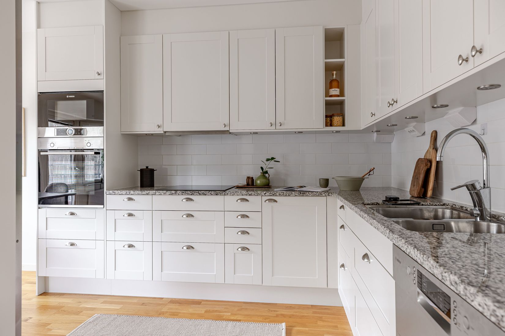 Kök och vardagsrum i öppen planlösning med plats med både stort middagsbord och en rejäl soffgrupp. En social lägenhet med sällskapsytor som bjuder in till umgänge, mingel och trevliga middagar, Köket är utrustat med kyl, frys, diskmaskin, spis, ugn och mikro. Allt man behöver i ett läckert utförande.