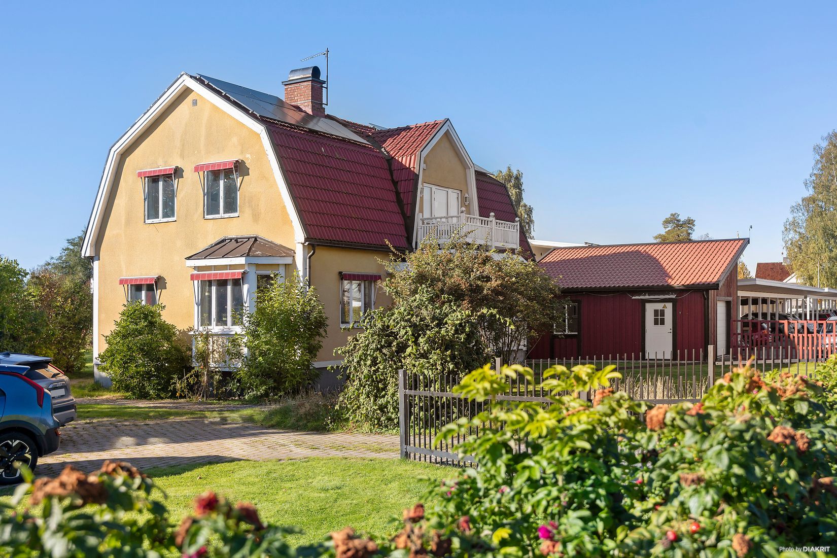 Den grönskande trädgården bjuder in till både lek och lugn. På taket sitter solpanelerna diskret, ett modernt inslag som smälter väl in i den tidstypiska arkitekturen och gör huset lika praktiskt som charmigt.