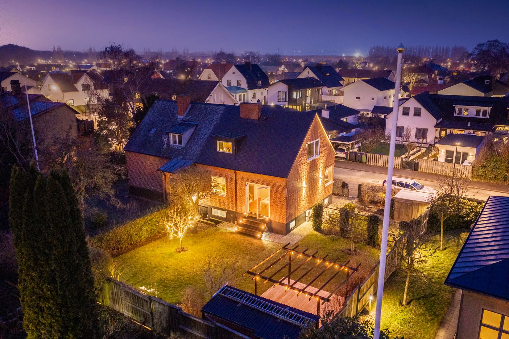 Den stilrent anlagda trädgården är en förlängning av hemmet, med ett generöst trädäck, pergola och en mysig grillplats som bjuder in till långa sommarkvällar. Här skapas minnen med familj och vänner.