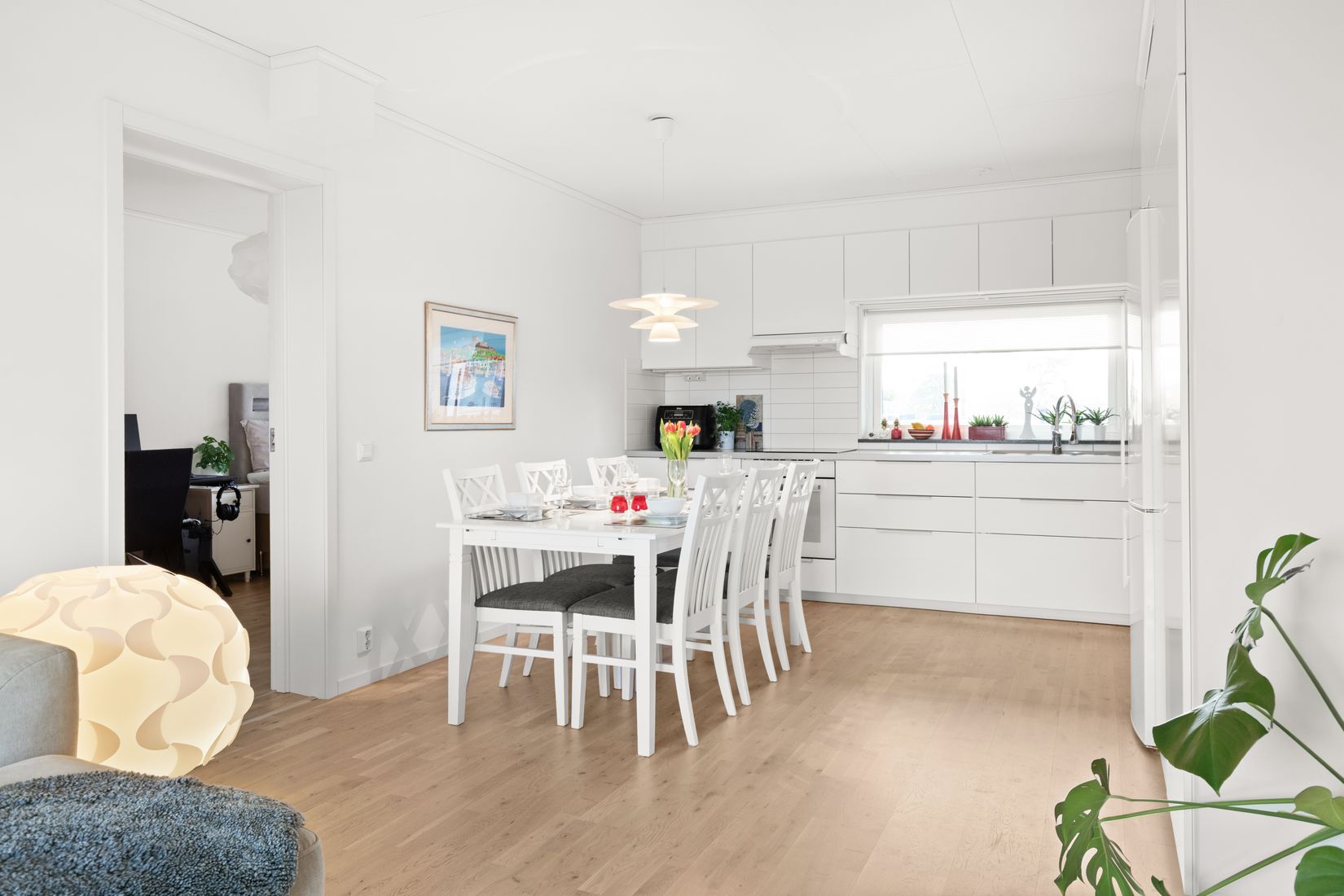 Bostaden erbjuder moderna materialval, genomgående parkettgolv och en genomtänkt planlösning som optimerar varje kvadratmeter. Den öppna planlösningen mellan kök och vardagsrum ger en luftig och social känsla. Vardagsrummet har direkt utgång till den soliga balkongen i sydväst.
