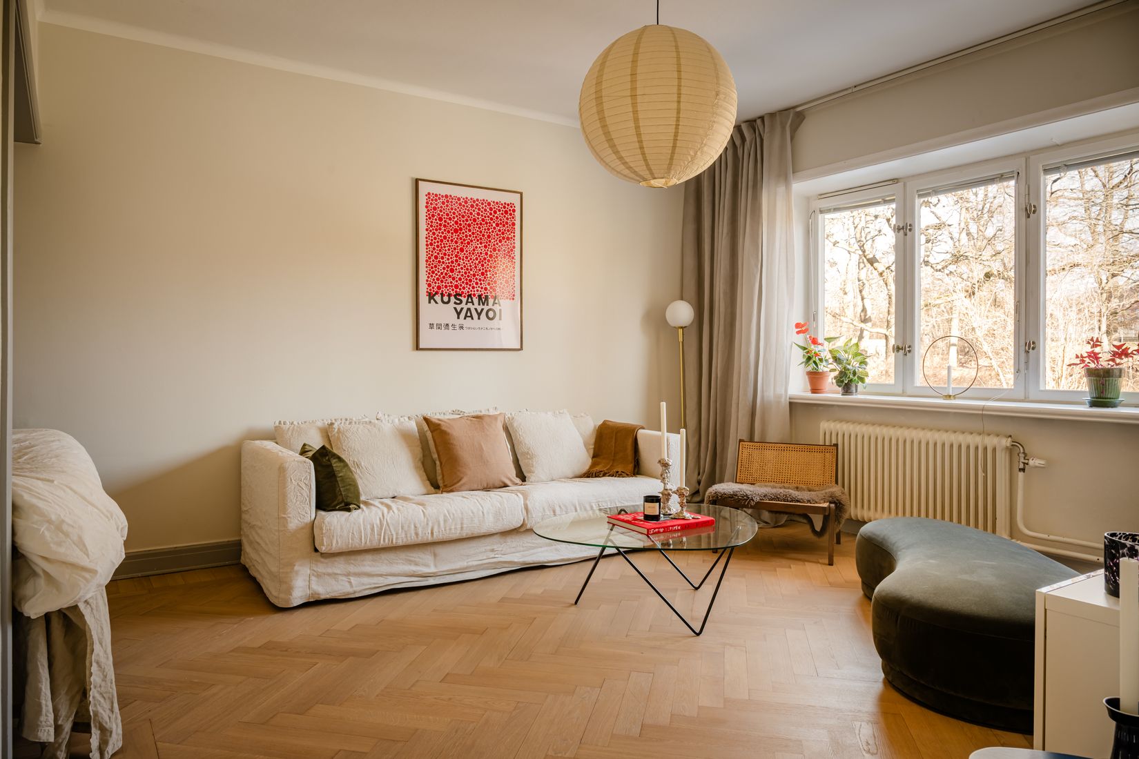 Ett rum som bjuder in till både lugna kvällar och livliga middagar med vänner. Här strömmar ljuset in genom det stora fönsterpartiet och skapar en luftig och varm atmosfär. Den vackra fiskbensparketten, takrosetten och de harmoniska färgerna ger rummet en elegant inramning. Här ryms både en generös soffgrupp, en matplats och den smart placerade sovalkoven – en naturligt avskild och ombonad sovdel som gör rummet både socialt och praktiskt.
