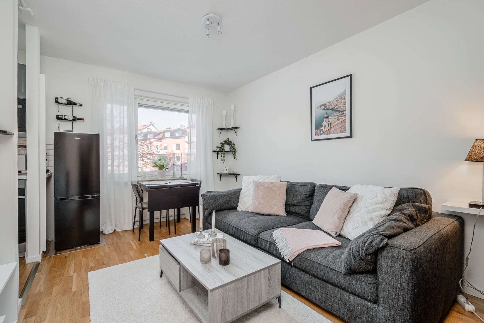 Vardagsrum med stora fönster mot den trivsamma innergården, helkaklat badrum med dusch, en kokvrå där man faktiskt får plats och en mysig sovalkov gör den till ett synnerligen bra val för den som ska köpa sitt första lägenhet alternativt den som vill skala ner till något mindre och mer lättskött.