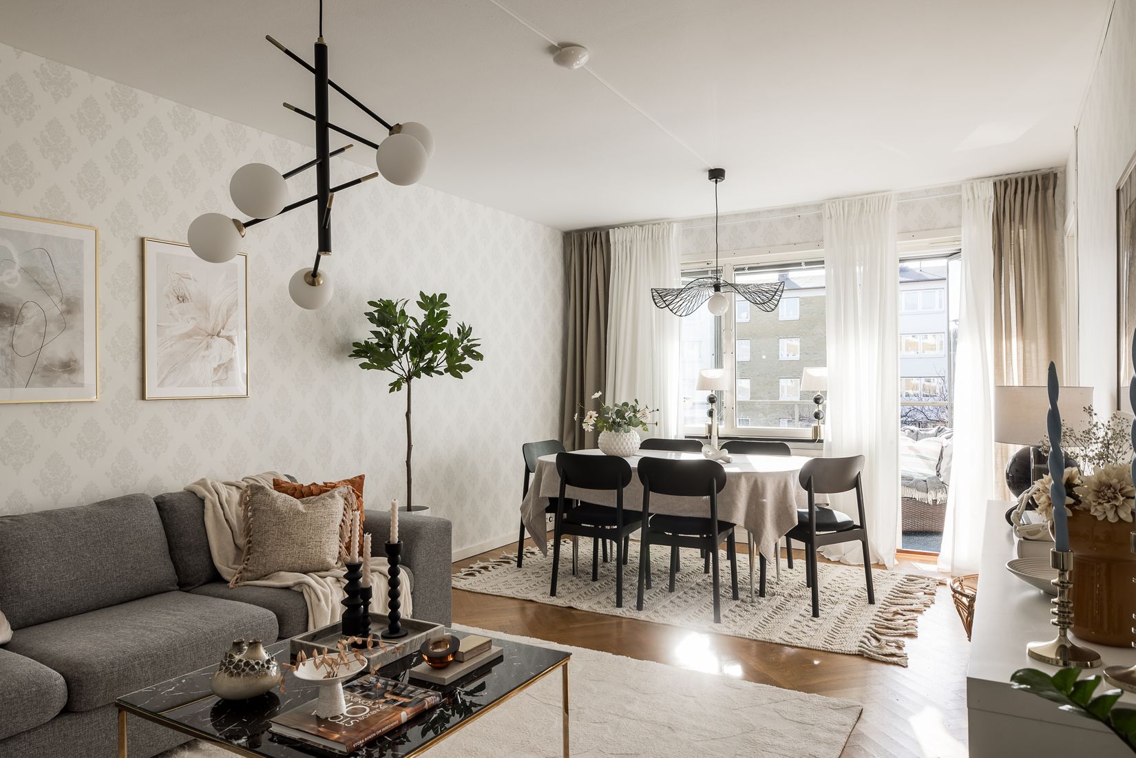 Vidare in i bostaden öppnar vardagsrummet upp sig – ett generöst rum där det finns gott om plats för både en större soffgrupp och en rymlig matplats för middagar med familj och vänner. Ett vackert parkettgolv i fiskbensmönster bidrar med en varm och klassisk känsla och de stora fönstren ger rummet ett härligt ljusinsläpp. Från vardagsrummet nås även balkongen som blir en naturlig plats att slå sig ner på under soliga dagar. Här finns utrymme för utemöbler och grönska, och utsikten över den lugna gårdsmiljön skapar en trivsam och avkopplande atmosfär.