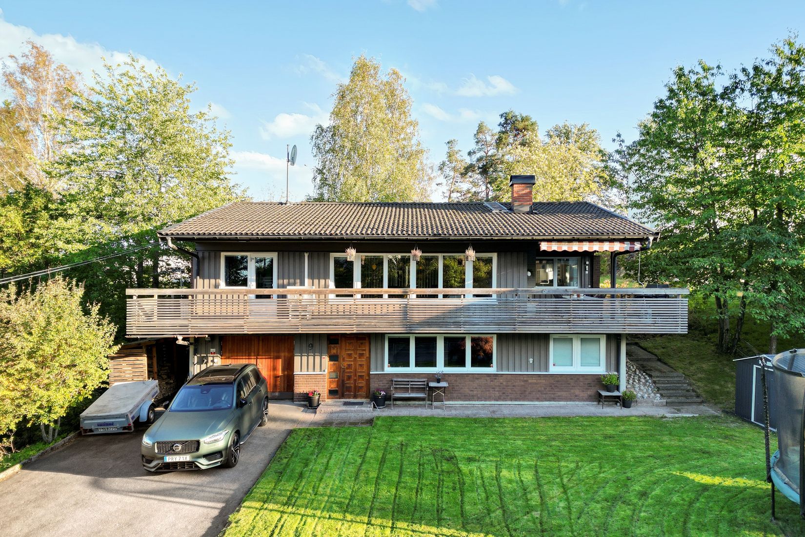 Välkommen till detta stilsäkra och familjevänliga hus i två plan. Detta mycket välplanerade hus erbjuder stora sociala ytor, fyra utmärkta sovrum samt härlig relaxavdelning med bastu. Njut av en väl tilltagen tomt med en stor platt gräsmatta på framsidan, perfekt för lek och bus, och på baksidan av huset finner du en skyddad altan ut mot mysig skogstomt. Från vardagsrummet når du stor balkong/terrass, med öppen spis, som inbjuder till härligt häng under årets varma årstider. Entréplanet erbjuder ett stort allrum med fungerande öppen spis. Utöver allrummet finner du på detta plan även relaxavdelning med bastu, sovrum, stort gym, WC och tvättstuga. Inte att förglömma är det rymliga garaget som nås inifrån huset. Trappan tar dig upp till övre plan där du kommer upp till en stor social yta med vardagsrum och matplats i öppen planlösning. Ett härligt ljus ges från ett stort antal fönster. Det snygga och fullutrustade köket ligger med halvöppen planlösning mot matplatsen. Med fördel ryms även matbord i köket om så önskas. Från köket har du utgång till altanen på husets baksida. På övre plan finner du därtill tre utmärkta sovrum och rymligt badrum. Genomgående finner du fina ekparkettgolv. Huset är utrustat med solceller med en maxkapacitet på ca 10.940 kWh per år. Ett extra plus är även den stora asfalterade uppfarten som rymmer flera bilar.