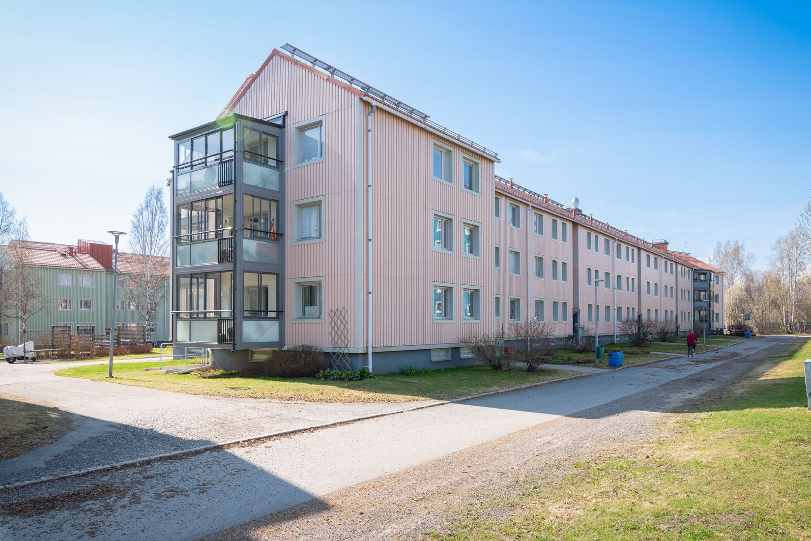 Omgjord gavellägenhet belägen 1/2 trappa upp med stor fin inglasad balkong. Ytan om 64 kvm fördelades tidigare som en trerummare men nu har man öppnat upp väggen mellan köket och det mindre sovrummet för ett större kök och matplats. Mycket trevlig lägenhet i gaveln med fönster åt olika väderstreck. Köket känns extra luftigt och vid matplatsen finns gott om yta att inreda som extra kontor eller om det önskas bygga upp en vägg igen för ett andra sovrum. Nyrenoverat badrum 2023 med snygg våtrumsmatta på väggar och golv samt förberett för tvättmaskin. Stort sovrum med flertalet garderober likaså i hallen. Inglasad balkong med fin matta på golv, rullgardin, belysning och eluttag. Till lägenheten finns ett källarförråd samt en matkällarförråd.