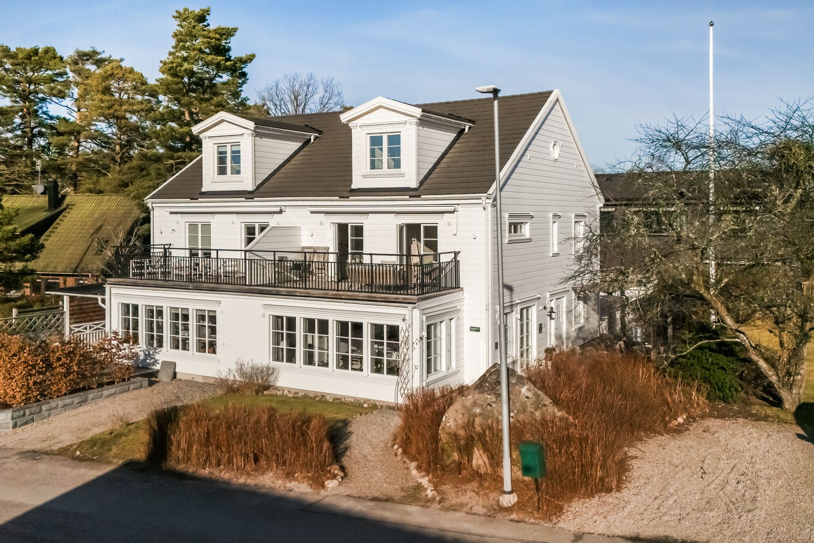 En trappa upp kommer vi till ett allrum med utgång till en stor balkong varifrån man verkligen kan njuta av utsikten över sjön Aspen och de stora villorna nedanför. Sovrummet intill har även det utgång till balkongen och våningsplanet rymmer ytterligare två sovrum i bra storlek. Badrummet här uppe, är liksom det på entréplanet, helkaklat med dusch.