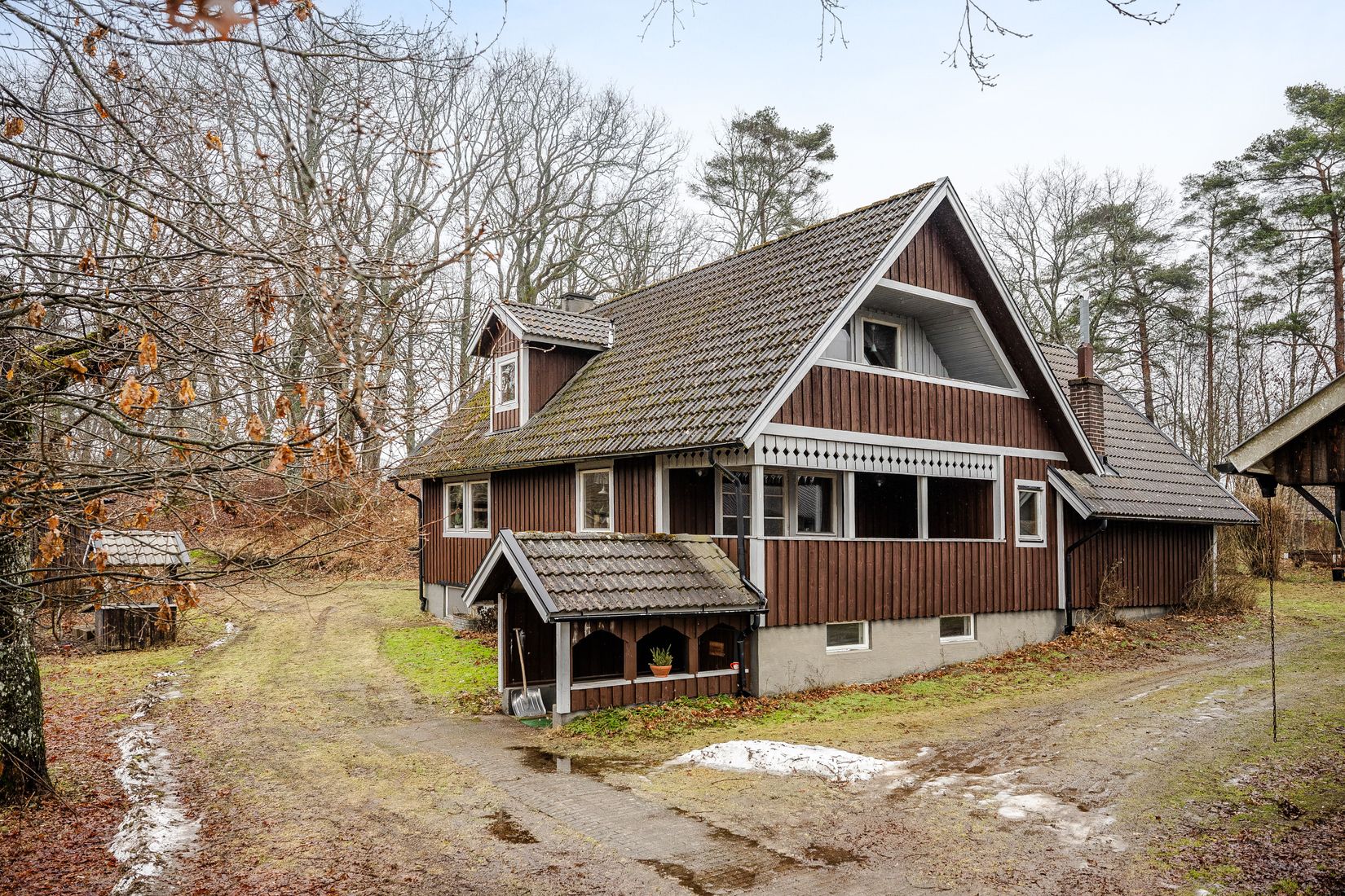 Här får du bl.a. tillgång generösa boytor och flera vardagsrum (varav ett med kamin i murad spis) på såväl nedan- som ovanvåning. Balkong, takförsedd veranda och en generös carport med tillhörande förrådsutrymme utmärker också fastigheten.