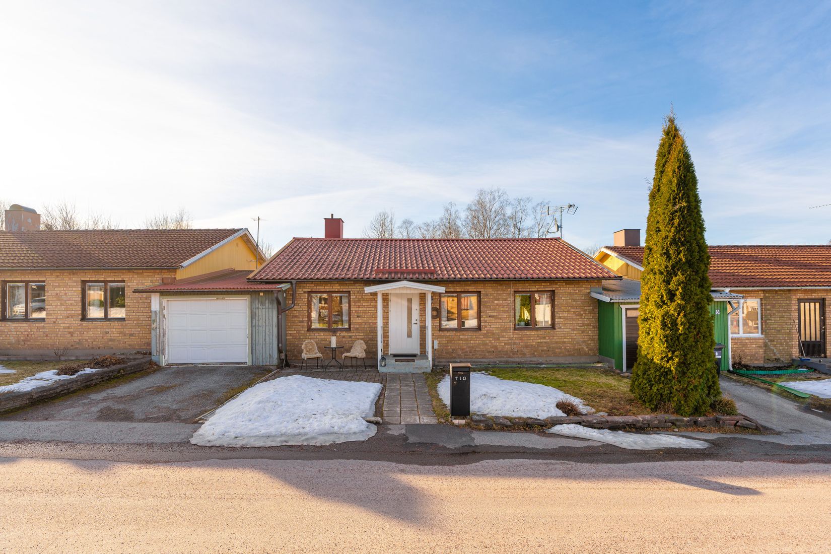 Kedjehuset har ett vidbyggt garage som nås direkt från huset, vilket underlättar vardagen. Garaget är utrustat med en fjärrstyrd port för enkel access. Den plattlagda uteplatsen i skyddat läge på baksidan av huset bjuder på härliga kvällar i kvällssolen.