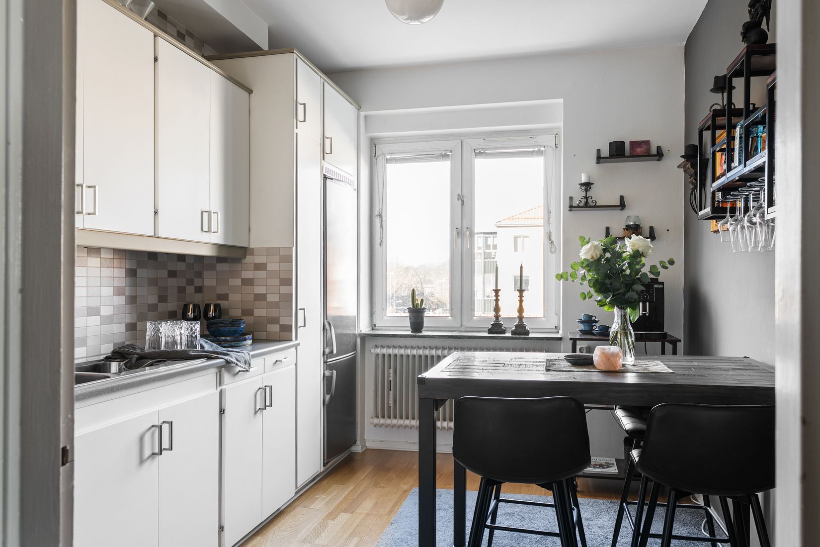 Lägenheten präglas av en härlig rymd med god takhöjd och ett fint flöde av dagsljus som skapar en luftig och inbjudande känsla genom hela bostaden. På golven ligger vacker ekparkett och väggarna är målade i moderna, neutrala kulörer som ger ett stilrent och harmoniskt helhetsintryck.