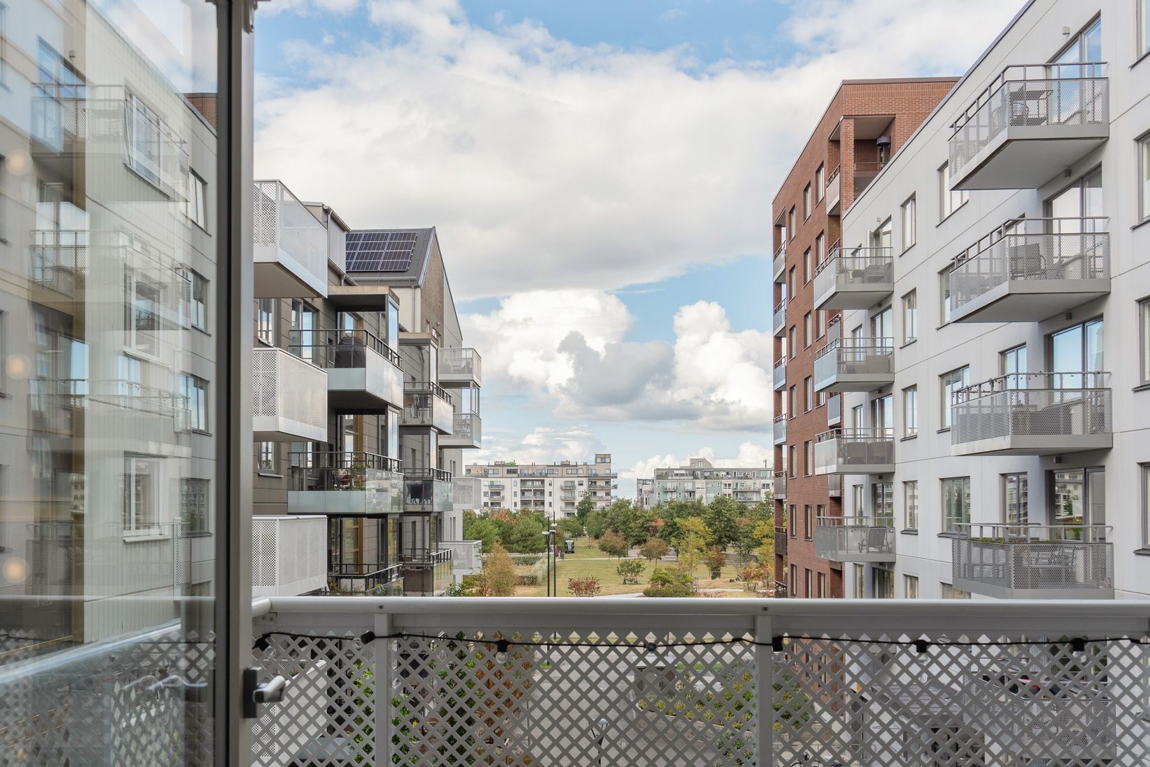 Från hallen når du ett stilrent badrum med mörkgrå klinkergolv och vita kakelväggar. Badrummet är utrustat med kommod, spegel med belysning och en kombinerad tvättmaskin och torktumlare. Vidare in i lägenheten öppnar sig en ljus och öppen planlösning, där kök och vardagsrum smälter samman för att skapa en modern och inbjudande atmosfär. Härifrån når du även den rymliga balkongen, perfekt för grillkvällar och avkoppling med fin utsikt. Vardagsrummet rymmer både en matplats och en mysig soffhörna. Balkongen, som nås från vardagsrummet, erbjuder en idealisk plats för att njuta av utomhuslivet.