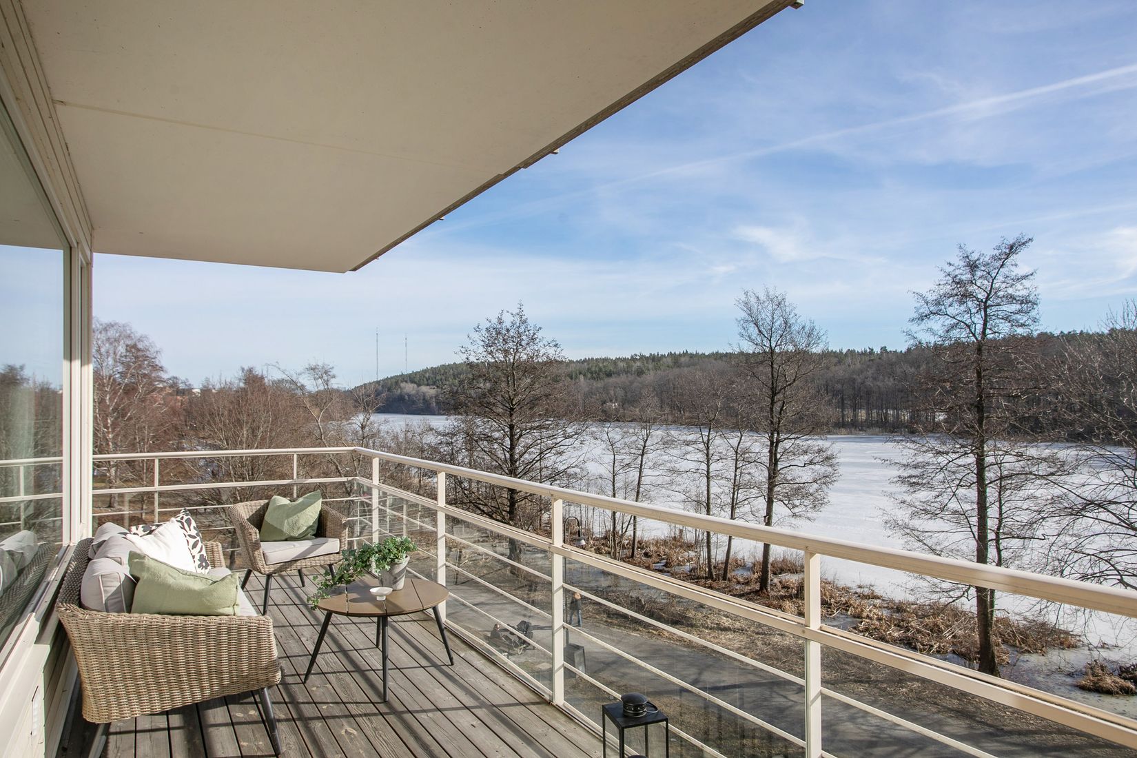 Lägenheten präglas av generösa fönsterpartier mot sjön som fyller bostaden med ett fantastiskt ljusinsläpp och skapar en harmonisk och luftig atmosfär. Från bostadens två balkonger erbjuds en hänförande utsikt över vattnet. Den större balkongen är något alldeles extra – en rymlig och privat oas med ett fritt läge direkt mot sjön där du kan njuta av solen, stillheten och de vackra vyerna över vattnet året om.