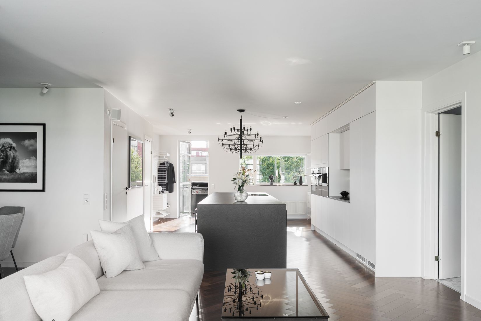 Interiören förmedlar ett rakt igenom elegant och tidlöst uttryck med material och färger som ger en känsla av ro. Golvytorna i rummen, bortsett från två av sovrummen som har heltäckningsmatta, pryds av fiskbensmönstrad valnötsparkett som utgör en fin kontrast till väggarnas ljusa inramning. Valnöt är även en accent som återkommer även som akustikpanel på en vägg i matplatsen och ett av sovrummen samt en del av köksön. I övrigt går köket huvudsakligen i grafitgrått och badrummen i en varm beige ton. Lägenheten erbjuder totalt fyra rum, varav det minsta intill sällskapsavdelningen har skjutdörrar utåt balkongen. Ytorna som har lagts på kök, matplats och sällskapsrum är generösa och gör det att umgås oavsett begivenhet. Inte heller saknas funktionaliteten. Tre av sovrummen är praktiskt samlade med en inre hall, klädkammare och badrum i centrum. I anslutning till den luftiga hallen finns ytterligare ett badrum och ett separat tvättrum.