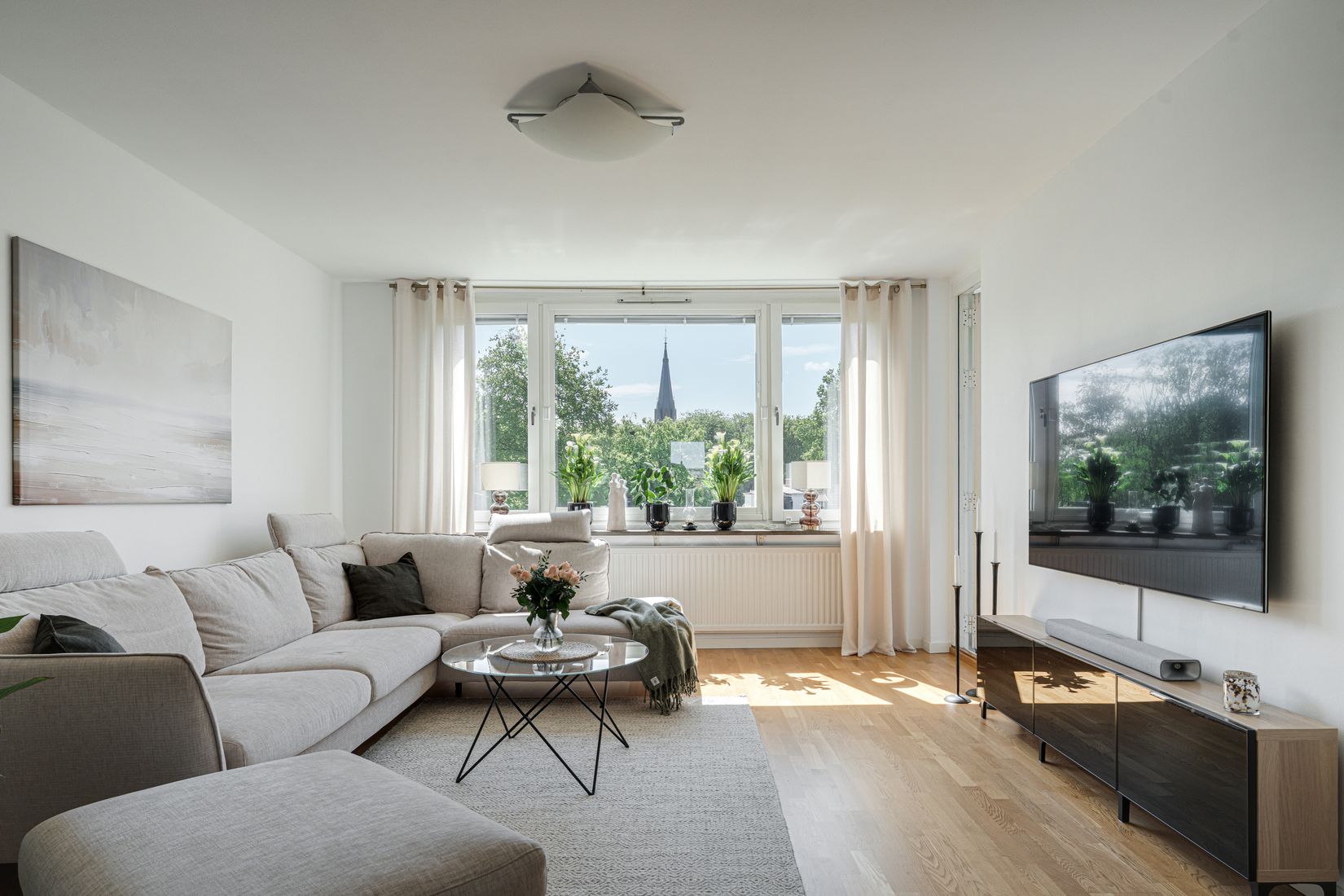 Lägenhetens vardagsrum är stort och luftigt med parkettgolv och vitmålade väggar. Här finns plats för både soffgrupp, matbord och tv-möbler, och från vardagsrummet nås den inglasade balkongen som är insynsskyddad och erbjuder en härlig plats för avkoppling eller umgänge under stora delar av året.