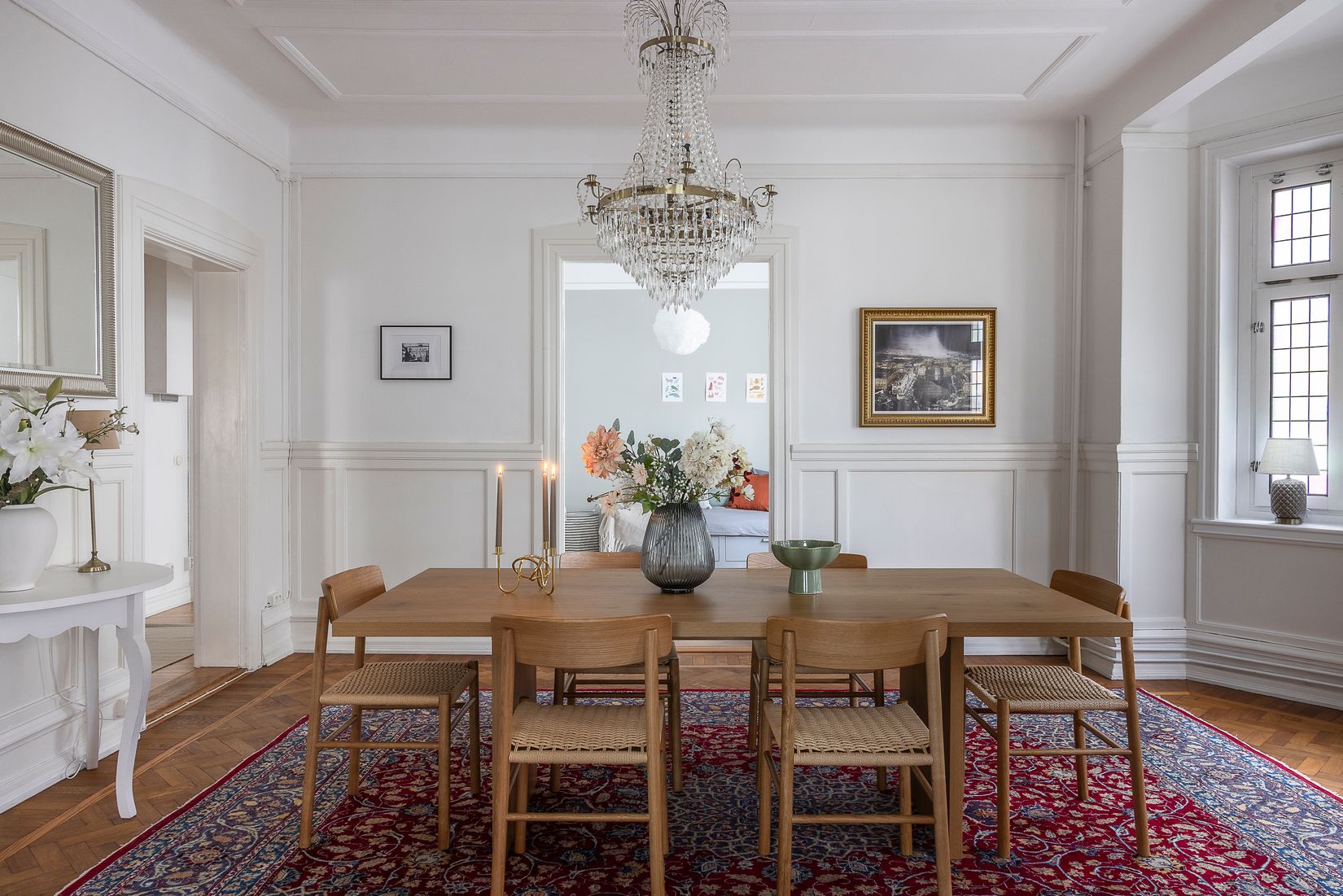Lägenheten är genomgående med ett vackert ljusflöde och på golven löper fiskbensparkett och klassiska brädgolv som skapar en harmonisk och enhetlig känsla. Bostaden erbjuder dessutom ett rymligt badrum utrustat med både tvättmaskin och torktumlare, samt en praktisk gäst-wc.