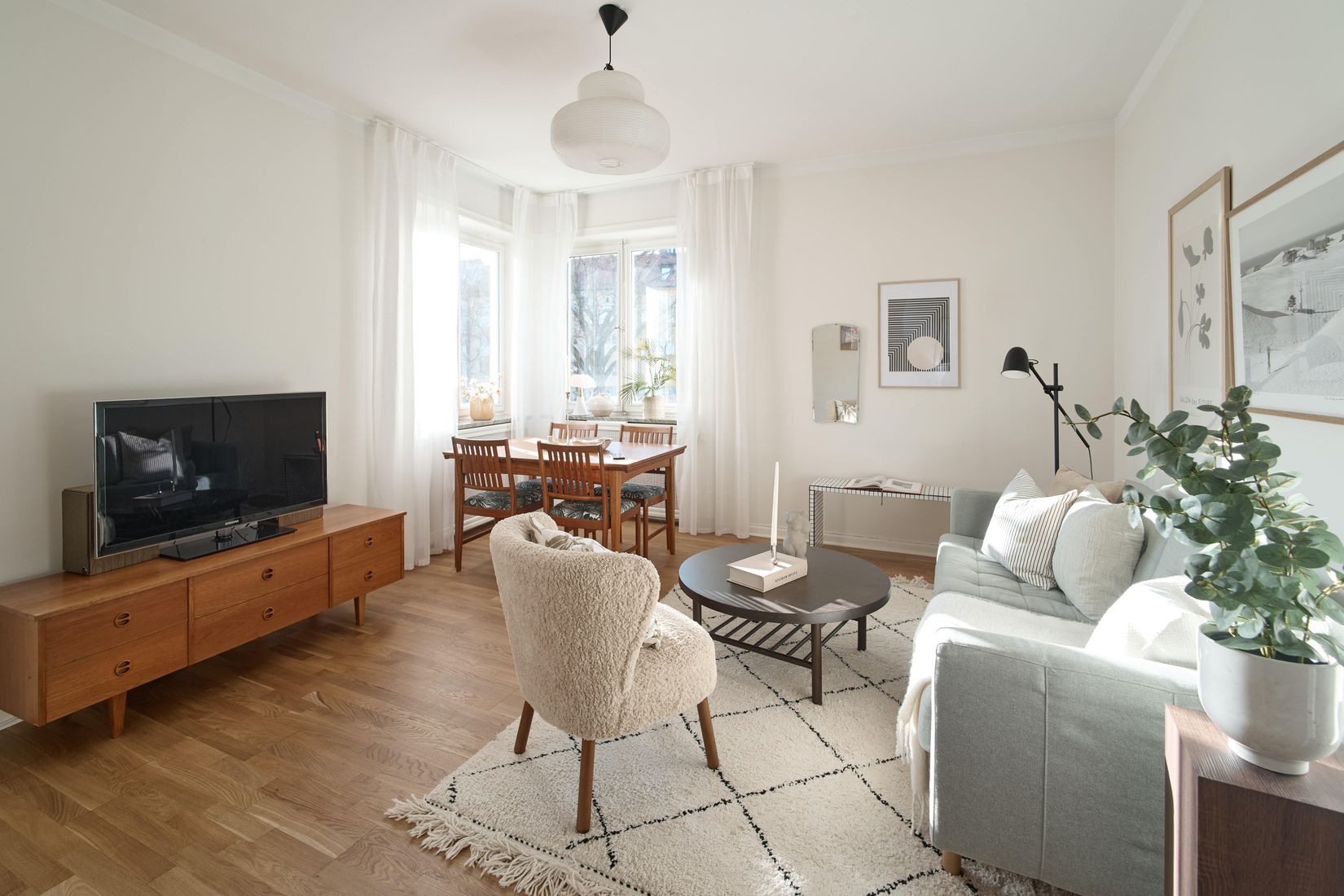 Stilrent renoverad trerumslägenhet med härligt hörnläge och generöst ljusinsläpp! Fastigheten, byggd i slutet av 1930-talet, bevarar många vackra funkisdetaljer såsom högt i tak, marmorfönsterbänkar och fönster med spanjoletter. Den modern planlösningen erbjuder en delvis öppen planlösning mellan kök och vardagsrum, vilket skapar sociala och luftiga ytor. Vardagsrummet rymmer både soffgrupp och matbord, medan det snyggt renoverade köket erbjuder integrerad diskmaskin och arbetsbänkar i Carraramarmor. Lägenheten har två rymliga sovrum med gott om förvaring samt ett helkaklat, renoverat badrum med tvättmaskin. Genom hela lägenheten ligger ett enhetligt golv och väggarna är målade i behagliga toner, vilket ger en harmonisk och trivsam känsla. I stället för balkong har man tillgång till föreningens uteplats för möbler och grill. I föreningen finns också en gemensam bastu att nyttjas av föreningens medlemmar.
