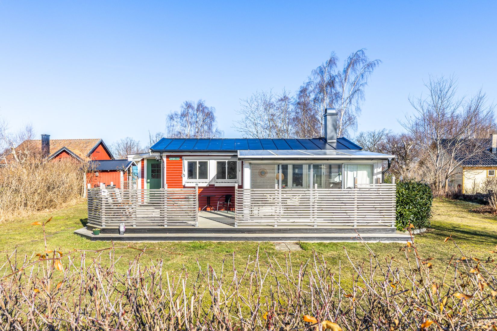 Utomhus finns flera härliga platser att njuta av lediga dagar. Den trevliga uteplatsen och det generösa trädäcket bjuder in till grillkvällar, avkoppling i solen och långa sommarkvällar tillsammans med nära och kära. Det stora uterummet förlänger säsongen ytterligare och ger en perfekt plats att sitta skyddad samtidigt som du har kontakt med trädgården och den omgivande naturen.